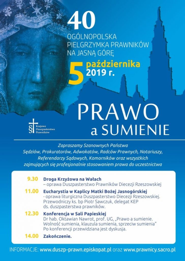Osoby, które są zainteresowane udziałem w wydarzeniu proszone są o zgłaszanie się do duszpasterza prawników ks. mgr lic. Krzysztofa Kamińskiego pod nr telefonu: 500 005 825.