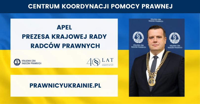 Prezes Krajowej Rady Radców Prawnych Włodzimierz Chróścik zaprasza do współpracy z Centrum Koordynacji Pomocy Prawnej wszystkich chętnych prawników oraz osoby mogące pomóc w tłumaczeniu na język ukraiński. Osoby chętne do zaangażowania się w projekt proszone są o wypełnienie formularza dostępnego pod linkiem: https://bit.ly/36JNaSL