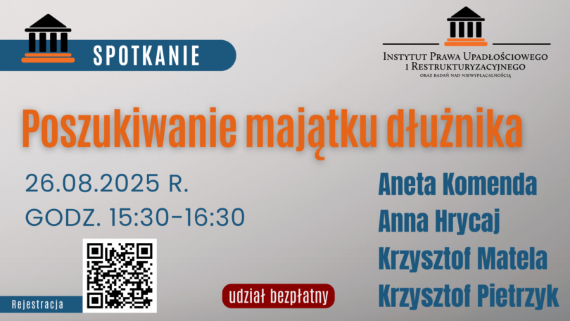 w imieniu Instytutu Prawa Upadłościowego i Restrukturyzacyjnego zapraszamy do bezpłatnego udziału w spotkaniu online: Poszukiwanie majątku dłużnika (26 sierpnia 2025r., godz. 15.30-16.30) – spotkanie online.