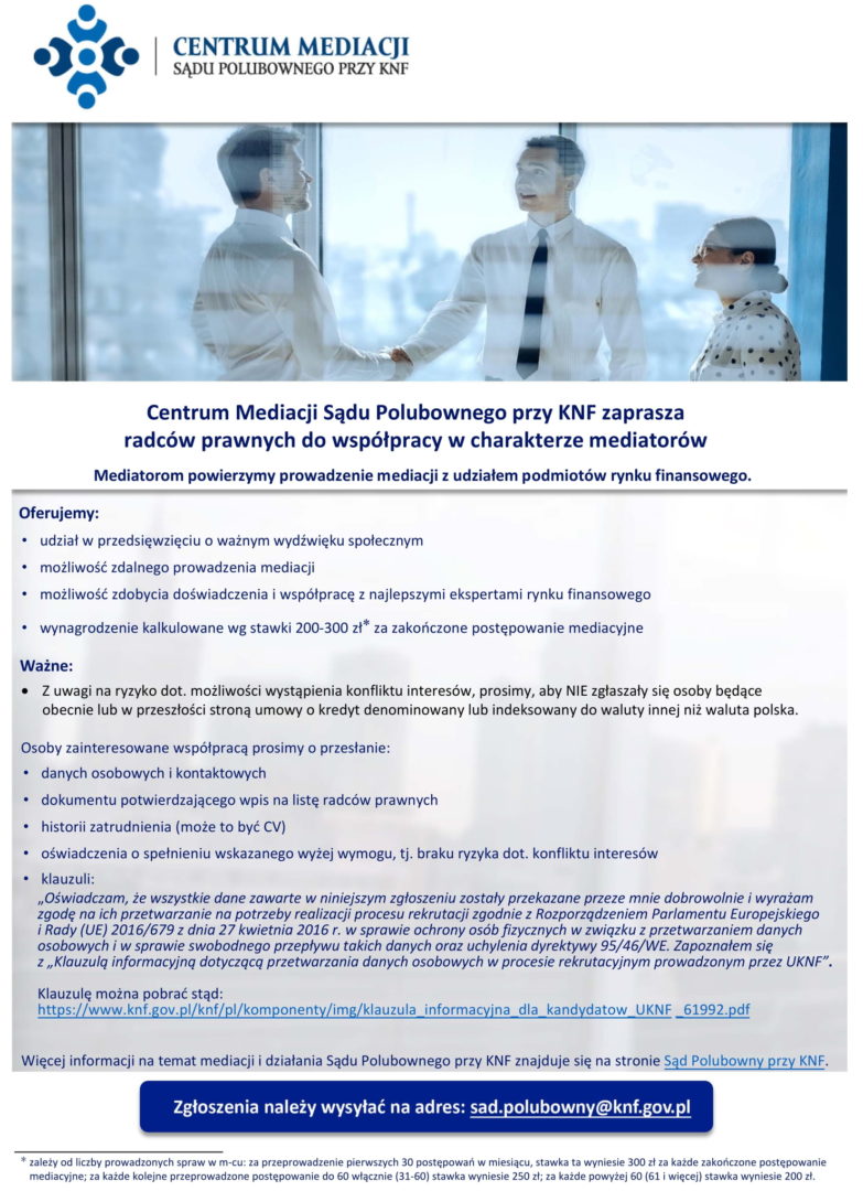 Więcej informacji na temat mediacji i działania Sądu Polubownego przy KNF znajduje się na stronie Sądu Polubownego przy KNF (https://www.knf.gov.pl/dla_rynku/sad_polubowny_przy_KNF).