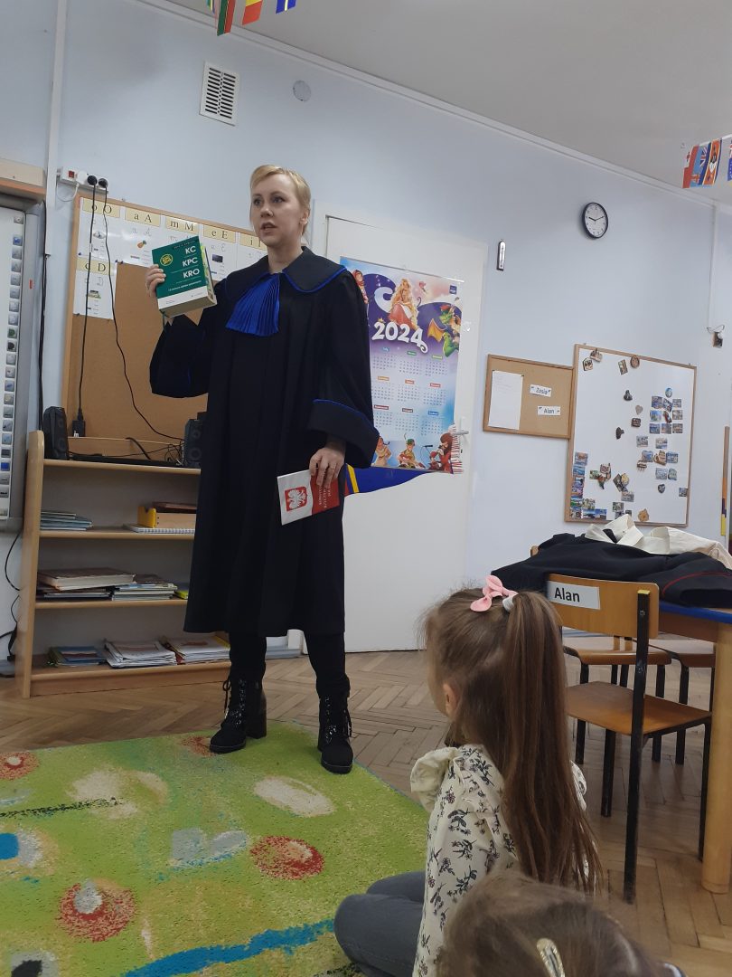 Podczas spotkania przedszkolaki dowiedziały się jakie mamy zawody prawnicze na czym polegają i czym się od siebie różnią. Dzieci otrzymały wiedzę o najważniejszych prawach i obowiązkach dziecka oraz z jakich przepisów one wynikają.