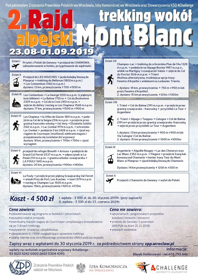 Zarząd Zrzeszenia Prawników Polskich Oddział we Wrocławiu zaprasza na II Rajd Alpejski. Przyszła edycja rajdu będzie trekkingiem wokół Mont Blanc. Tour ten uznawanym jest za jeden z najpiękniejszych na świecie, albowiem biegnie przez zielone przełęcze oraz lazurowe jeziora, nad którymi wspinają się majestatyczne góry z ośnieżonymi szczytami. Niewątpliwym atutem rajdu jest kulturowa różnorodność, gdyż jego trasa wiedzie przez trzy kraje alpejskie: Francję, Włochy oraz Szwajcarię. Trekking zaczniemy od północnej strony Mont Blanc w miejscowości Chamonix, potocznie zwanej ,,mekką wspinaczy’’. Następnie skierujemy się (odwrotnie do wskazówek zegara) na zachód, później na południe do Cournmayer i dalej do Trientu, by w końcu znaleźć się z powrotem w kurorcie u podnóża Białej Góry. Z pewnością uczestnicy winni dysponować dobrą kondycją fizyczną, jednak trasa rajdu zawiera alternatywne, krótsze odcinki, które nie powinny stanowić trudności dla osób w słabszej formie.