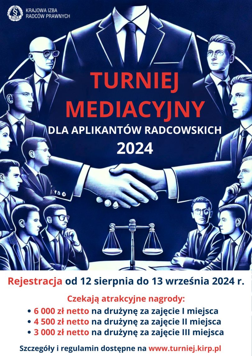 Krajowa Izba Radców Prawnych zaprasza aplikantów radcowskich do udziału w trzeciej edycji Turnieju Mediacyjnego dla Aplikantów Radcowskich „Lider Mediacji 2024”.
