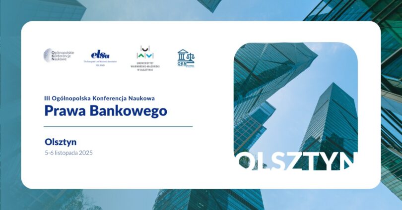 W dniach 5-6 listopada 2025 r. w Olsztynie odbędzie III edycja Ogólnopolskiej Konferencji Naukowej Prawa Bankowego, organizowanej przez Europejskie Stowarzyszenie Studentów Prawa ELSA Olsztyn, Katedrę Prawa Finansowego i Prawa Podatkowego WPiA UWM, Koło Naukowe Prawa Inwestycyjnego WPIA UWM oraz współorganizatorów merytorycznych – Zakład Metodologii Prawoznawstwa i Badań Interdyscyplinarnych WPiA UŁ oraz Katedrę Prawa Finansowego WPiA UG.