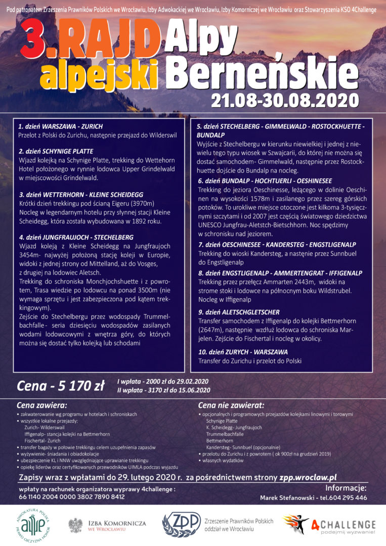 Zrzeszenie Prawników Polskich Oddział we Wrocławiu zaprasza na III Rajd Alpejski. Trekking odbędzie się w dniach od 21 do 30 sierpnia 2020 r. w Alpach Berneńskich określanych też jako “Małe Himalaje” Alp Szwajcarskich. Areną górskich zmagań będą wyjątkowo atrakcyjne trasy trekkingowe, w tym szlak Hintere Gasse przebiegający częściowo przez tereny wpisane na Listę UNESCO oraz podnóża gór “Wielkiej Trójki” Jungfrau, Mönch i Eiger. Przejdziemy obok najdłuższego w Europie lodowca Grosser Aletschgletscher oraz wjedziemy kolejką zębatą na Jungfraujoch, której trasa przebiega częściowo w wydrążonym tunelu wewnątrz Eigeru, a naturalne okno umożliwia spojrzenie w przepaść “morderczej ściany” (Mordwand). Dotrzemy do podziemnych wodospadów Trümmelbachfälle oraz licznych górskich wiosek całkowicie niedostępnych dla ruchu samochodowego. Towarzyszyć nam będą górzysta sceneria oraz kontrast między lasami i łąkami a ciemnymi skałami i białymi, lodowymi, ścianami. Patronat nad Rajdem objęła Izba Adwokacka we Wrocławiu, Izba Komornicza we Wrocławiu oraz Stowarzyszenie KSO 4Challenge. Zapisy odbywają się za pośrednictwem strony internetowej zpp.wroclaw.pl. Zapraszamy.