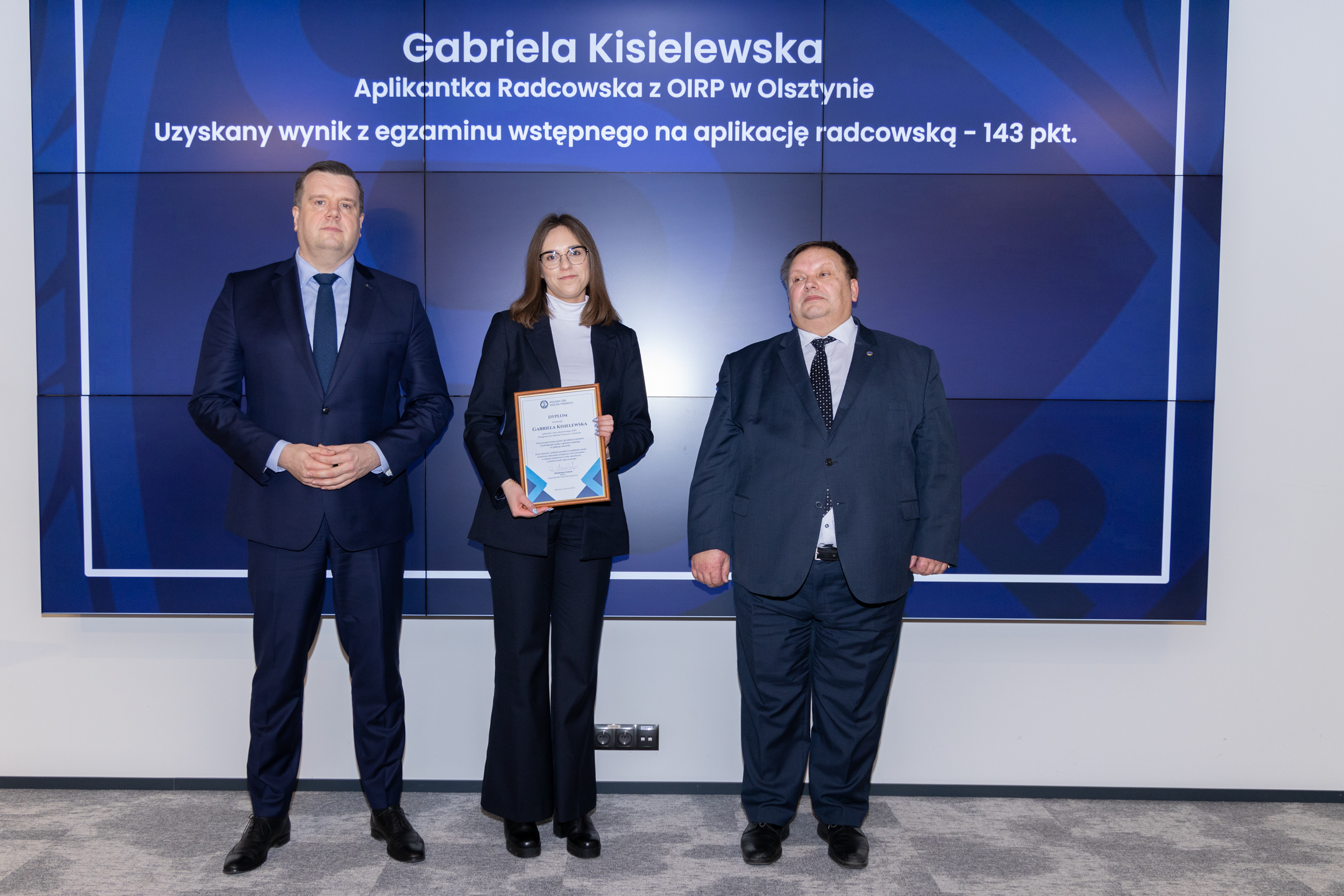 Najlepszy wynik spośród osób przystępujących do egzaminu w Olsztynie uzyskała Gabriela Kisielewska – 143 punkty – była to 4 nota w całym kraju! Serdecznie gratulujemy! W uroczystości z ramienia Prezydium Okręgowej Izby Radców Prawnych w Olsztynie wziął udział Wicedziekan Mirosław Tetkowski, który również objął patronatem naszą najlepszą Aplikantkę.