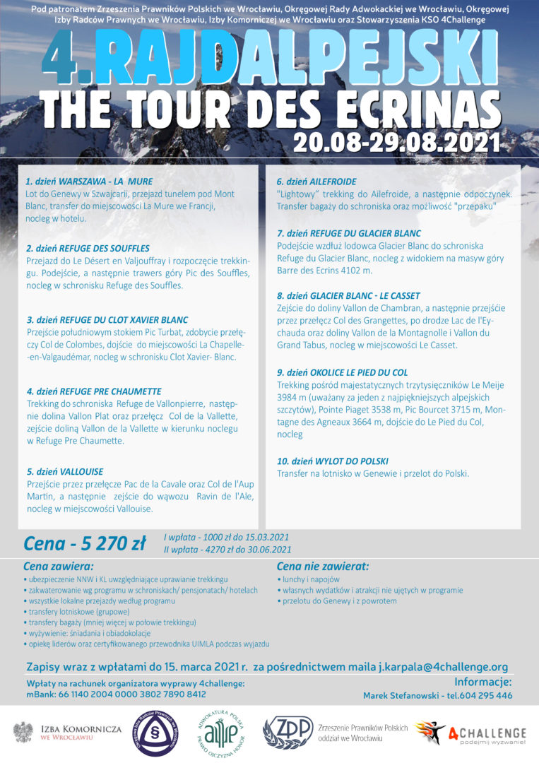 Zrzeszenie Prawników Polskich Oddział we Wrocławiu zaprasza na IV Rajd Alpejski. Trekking odbędzie się w dniach 20-29 sierpnia 2021 r. we Francji w Parku Narodowym Ecrins. Teren ten to Alpy Delfinackie, a najwyższy szczyt Barre des Ecrins o wysokości 4102 mnpm jest najdalej wysuniętym na południe czterotysięcznikiem w Alpach. Znaczna część tras Rajdu obejmuje wysokogórski szlak G54 The Tour des Ecrins. Droga ta wiedzie przez liczne przełęcze, doliny, obok jezior górskich i lodowców, przez galerię majestatycznych trzytysięczników pośród, których Le Meije o wysokości 3984 mnpm uważany jest za jeden z najpiękniejszych alpejskich szczytów. Tradycyjnie formuła Rajdu opiera się na wędrówce z lekkim plecakiem i nocowaniu w schroniskach zapewniających pełen komfort i wygodę. Dodatkowo dowóz bagażu w środku Rajdu pozwala na dobór optymalnego ekwipunku i uzupełnienie zapasów na dalszą część trekkingu. Patronat nad Rajdem objęła Izba Adwokacka we Wrocławiu, Izba Radców Prawnych we Wrocławiu oraz Izba Komornicza we Wrocławiu. Zapisy odbywają się za pośrednictwem maila wskazanego na plakacie Rajdu. Zapraszamy.