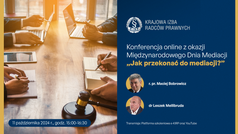 Krajowa Izba Radców Prawnych zaprasza na konferencję z okazji Międzynarodowego Dnia Mediacji p.n. „Jak przekonać do mediacji?”, która odbędzie się w dniu 11 października 2024 roku w formule on-line, za pośrednictwem platformy szkoleniowej e-KIRP i kanału You Tube KIRP w godzinach 15.00-16.30.
