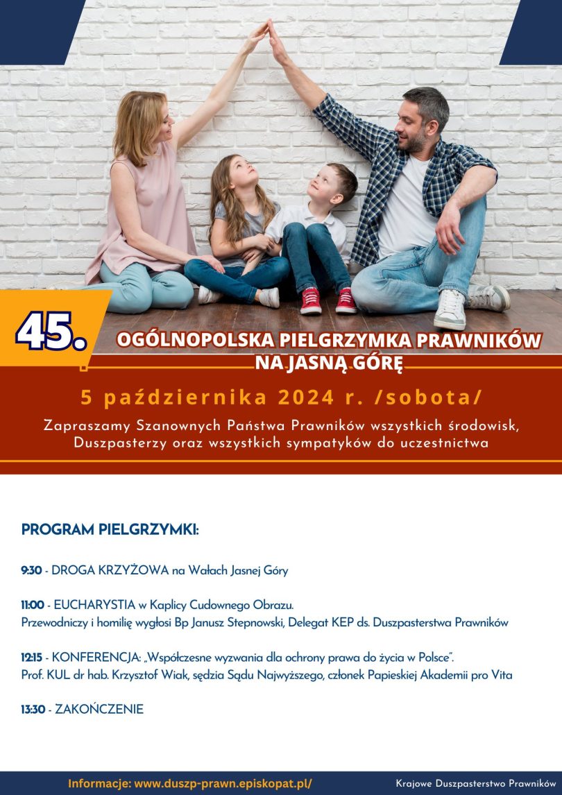 W imieniu Bpa Janusza Stepnowskiego oraz własnym serdecznie zapraszam do udziału w 45. Ogólnopolskiej Pielgrzymce Prawników na Jasną Górę w sobotę 5 października 2024 r.