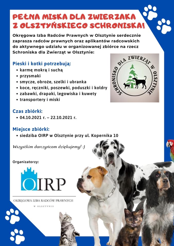 Z tej okazji chcąc w szczególny sposób zwrócić uwagę na los bezdomnych zwierząt i warunki bytowe w schroniskach nasza Izba startuje z organizacją zbiórki najpotrzebniejszych podarunków na rzecz Schronisko dla Zwierząt w Olsztynie .