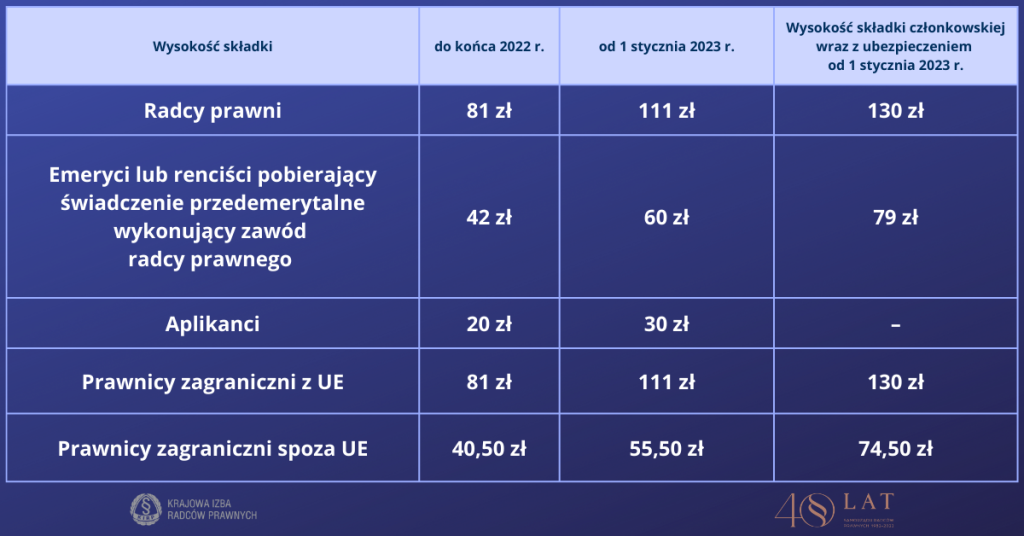Przypominamy, że uchwałą Krajowej Rady Radców Prawnych nr 116/XI/2022 z dnia 28 października 2022 r. zmieniającej uchwałę w sprawie wysokości składki członkowskiej i składki ubezpieczeniowej, zasad ich uiszczania i podziału dokonano zmiany składki z tytułu przynależności do samorządu zawodowego.