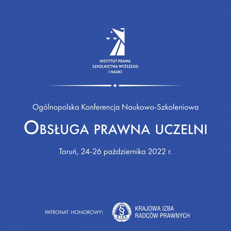 Publikujemy zaproszenie na Ogólnopolską Konferencję Naukowo-Szkoleniową pt. Obsługa prawna uczelni, która odbędzie się w dniach 24-26 października 2022 r. w Toruniu.