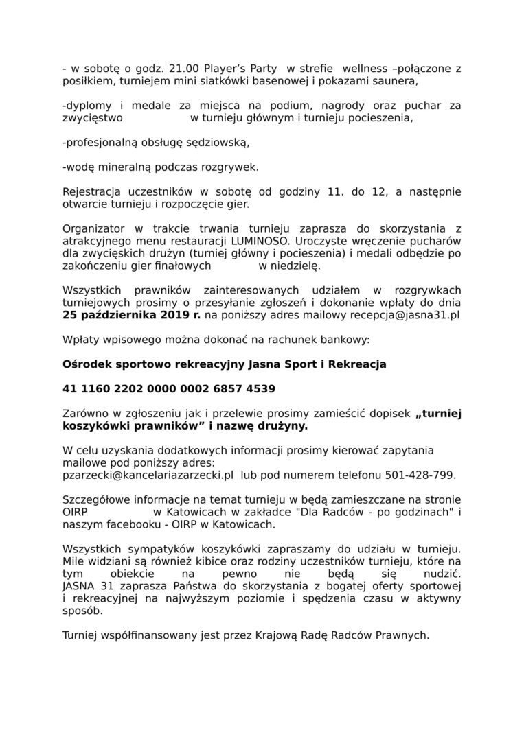 Wszystkich prawników zainteresowanych udziałem w rozgrywkach turniejowych prosimy o przesyłanie zgłoszeń i dokonanie wpłaty do dnia 25 października 2019 r. na poniższy adres mailowy recepcja@jasna31.pl