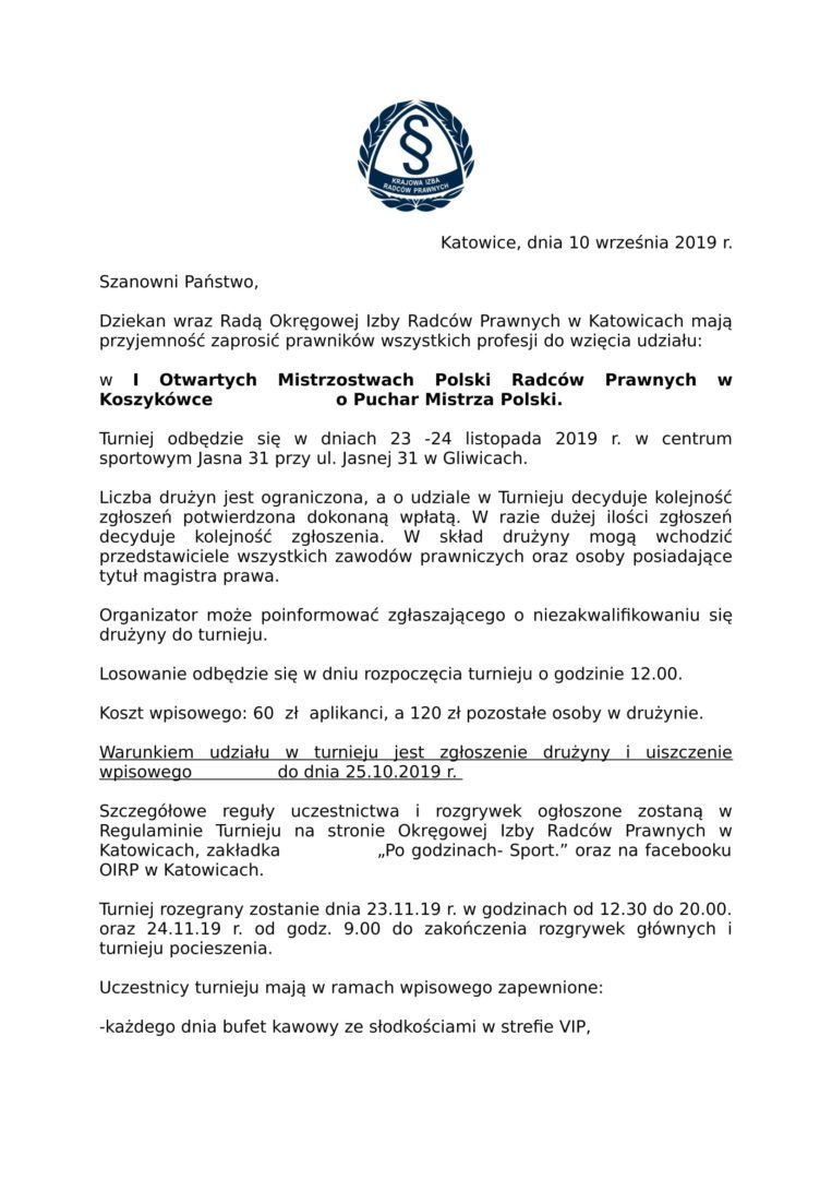 Dziekan wraz Radą Okręgowej Izby Radców Prawnych w Katowicach mają przyjemność zaprosić prawników wszystkich profesji do wzięcia udziału: