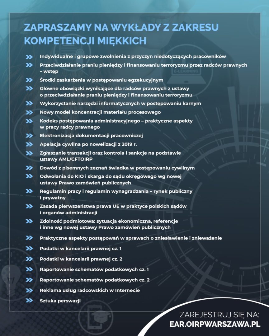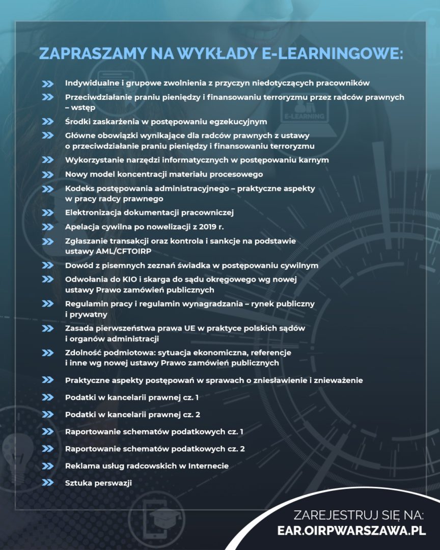 Okręgowa Izba Radców Prawnych w Warszawie uruchomiła ogólnokrajową dla wszystkich radców prawnych i aplikantów radcowskich platformę szkoleniową, zapraszamy do zapoznania z ofertą i skorzystania.