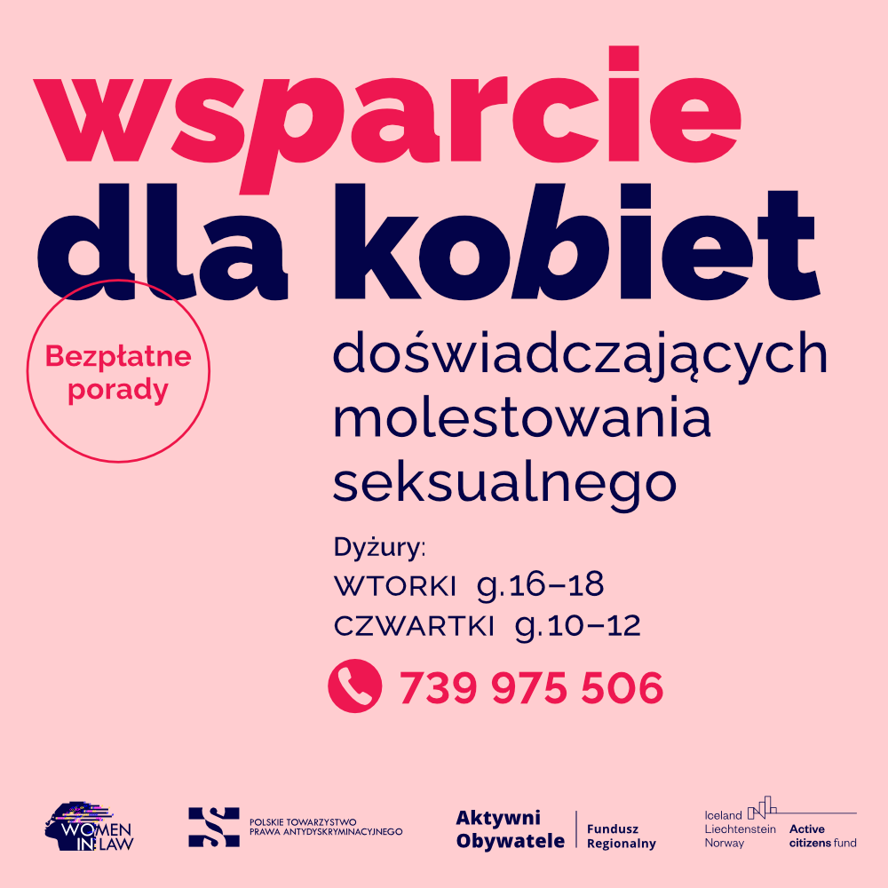 Informujemy, że Polskie Towarzystwo Prawa Antydyskryminacyjnego rozpoczęło nowy projekt “Wsparcie dla kobiet doświadczających molestowania seksualnego”.