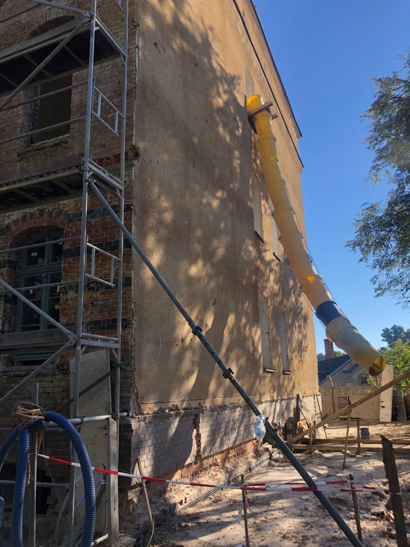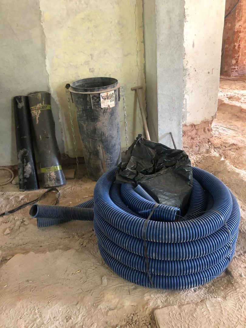 Wykonawca w dalszym ciągu realizuje prace związane z podbijaniem i izolacją fundamentów, na zewnątrz izolacja i docieplenie fundamentów zostało już wykonane, w piwnicach pozostało kilka metrów podbicia do wykonania. Są to prace, długotrwałe i mozolne, ze względu na piaski, które występują pod budynkiem. Prac tych nie widać w późniejszym okresie tzw. „gołym okiem”, dlatego cieszymy się, że dobiegają końca.