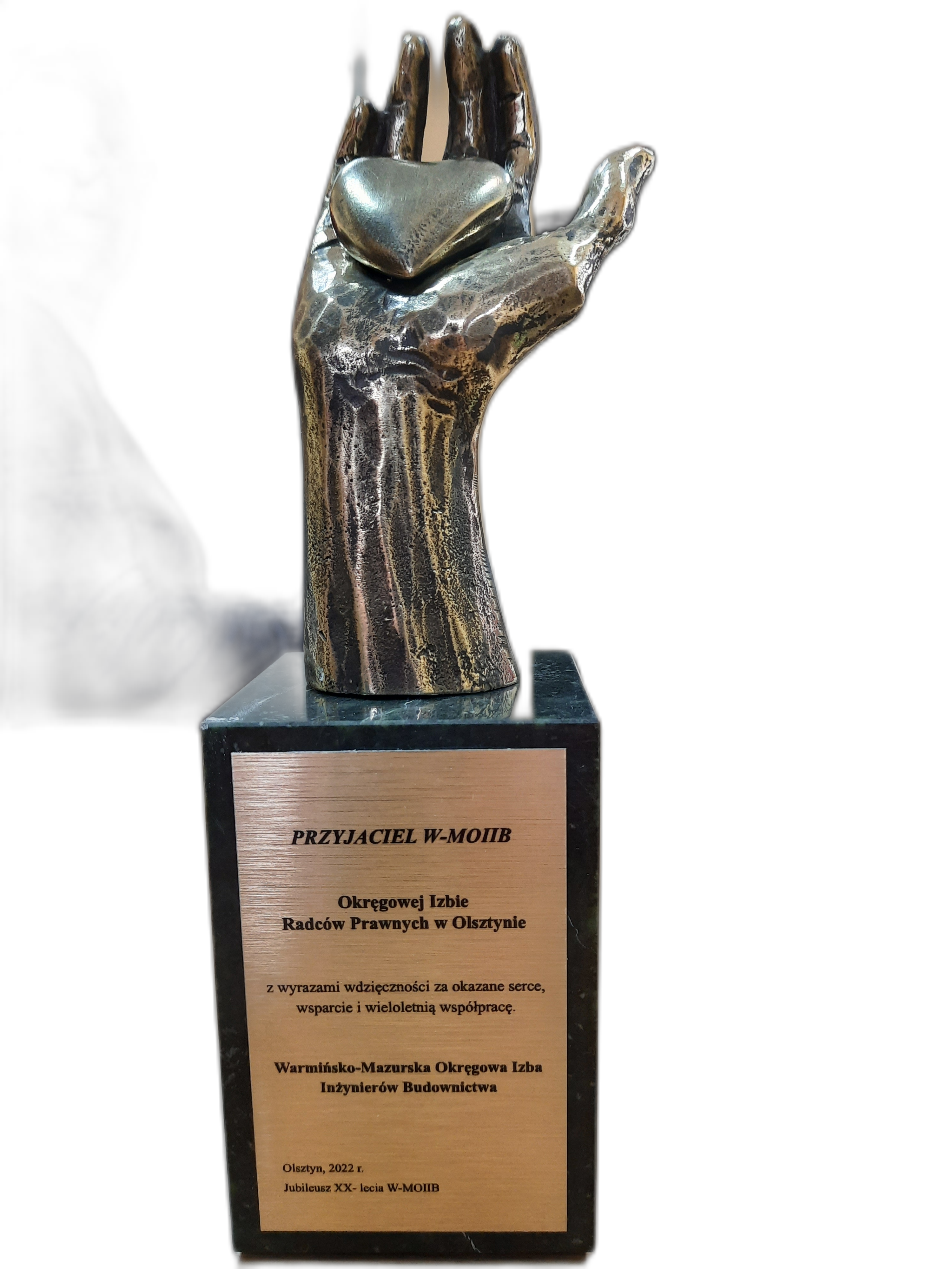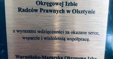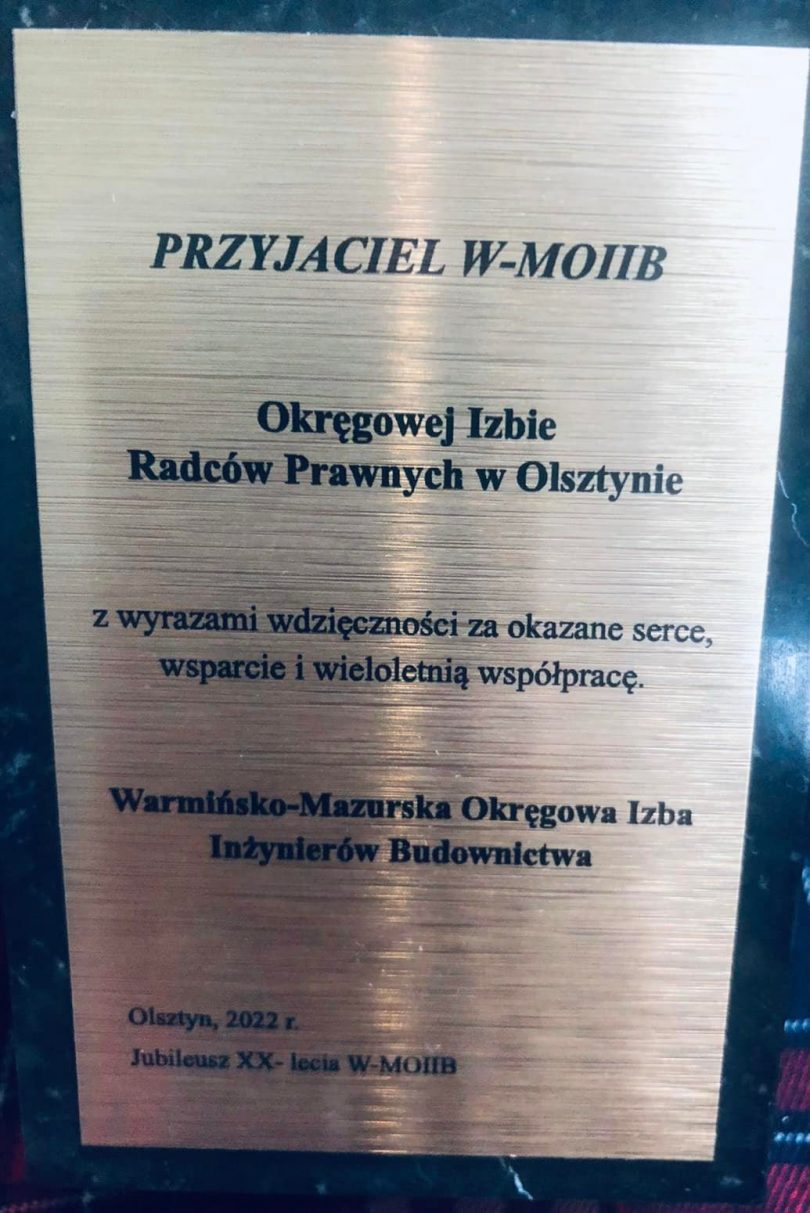 Podczas Zjazdu podkreślona została również współpraca z naszym samorządem – na ręce Dziekana OIRP w Olsztynie Pan Mariusz Dobrzeniecki wręczył Okręgowej Izbie Radców Prawnych – jedną z trzech statuetek – Przyjaciela W-MOIIB, którą prezentujemy na fotografii.