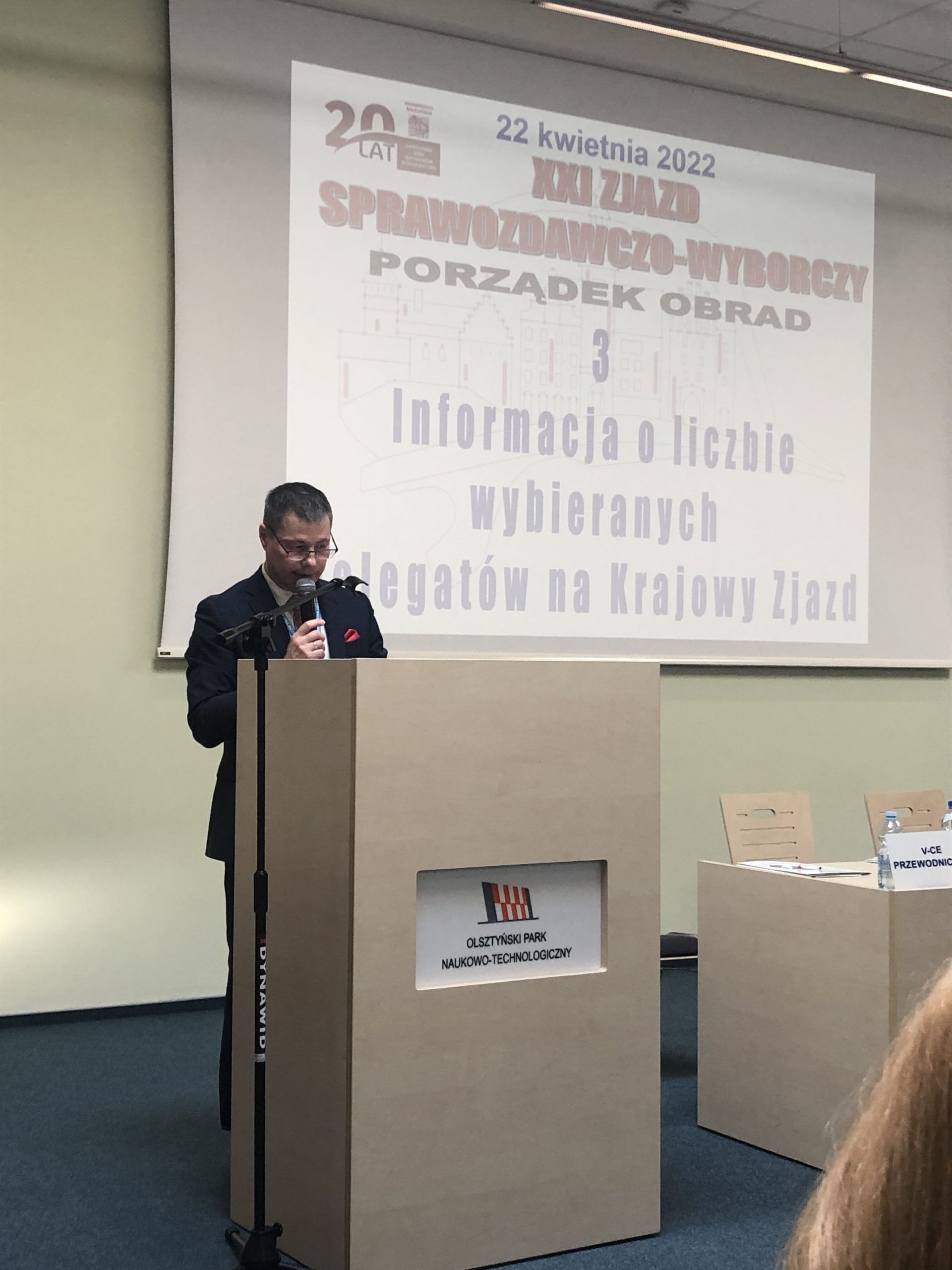 W piątek 22 kwietnia 2022 r. Dziekan Katarzyna Skrodzka-Sadowska na zaproszenie Pana Mariusza Dobrzenieckiego – Przewodniczącego Warmińsko-Mazurskiej Okręgowej Izby Inżynierów Budownictwa uczestniczyła w XXI Zjeździe Sprawozdawczo-Wyborczym zaprzyjaźnionej Izby.