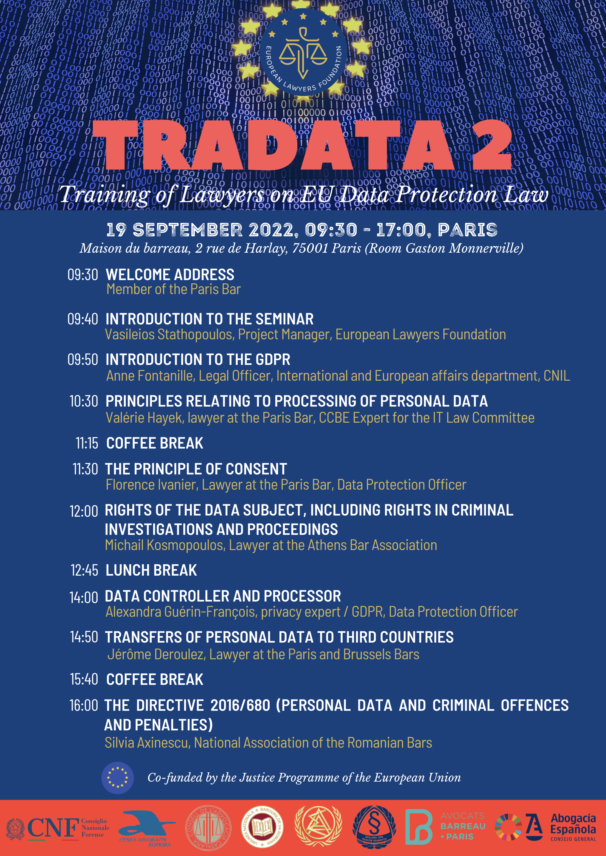 Seminarium jest kolejnym w cyklu wydarzeń w ramach TRADATA 2 https://elf-fae.eu/tradata2/ organizowanego przez Fundację Prawników Europejskich i współfinansowanego z środków Programu Sprawiedliwość Unii Europejskiej. Krajowa Izba Radców Prawnych jest partnerem Programu