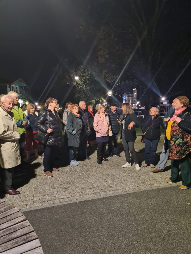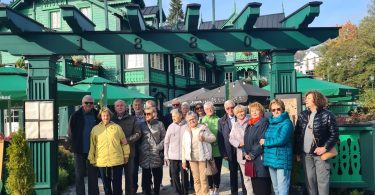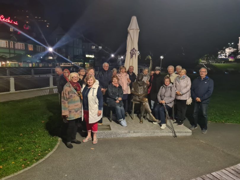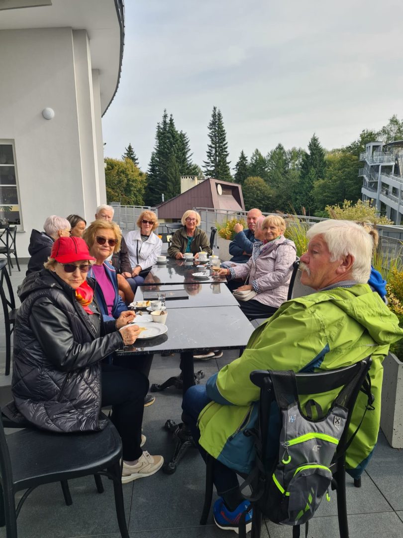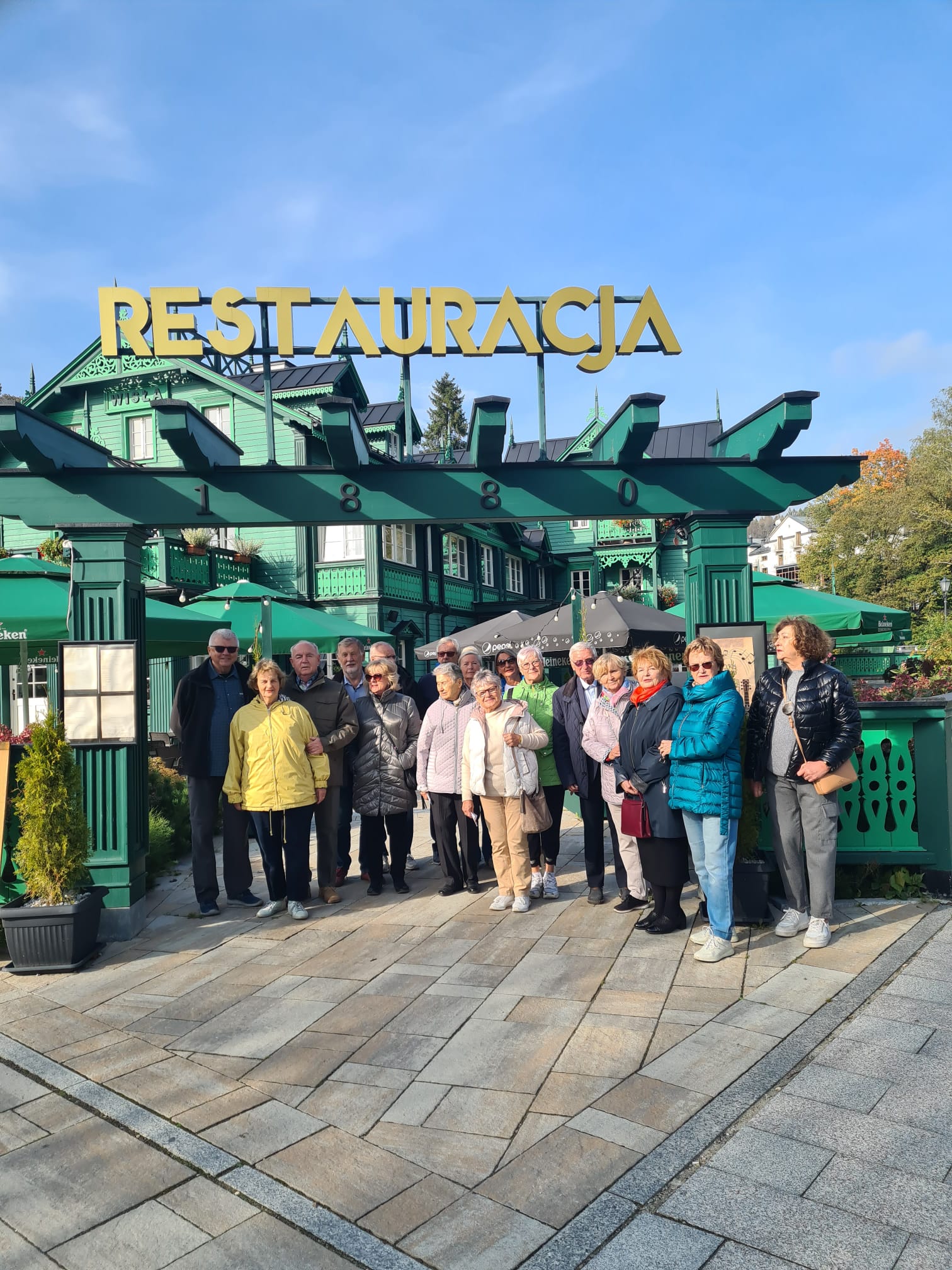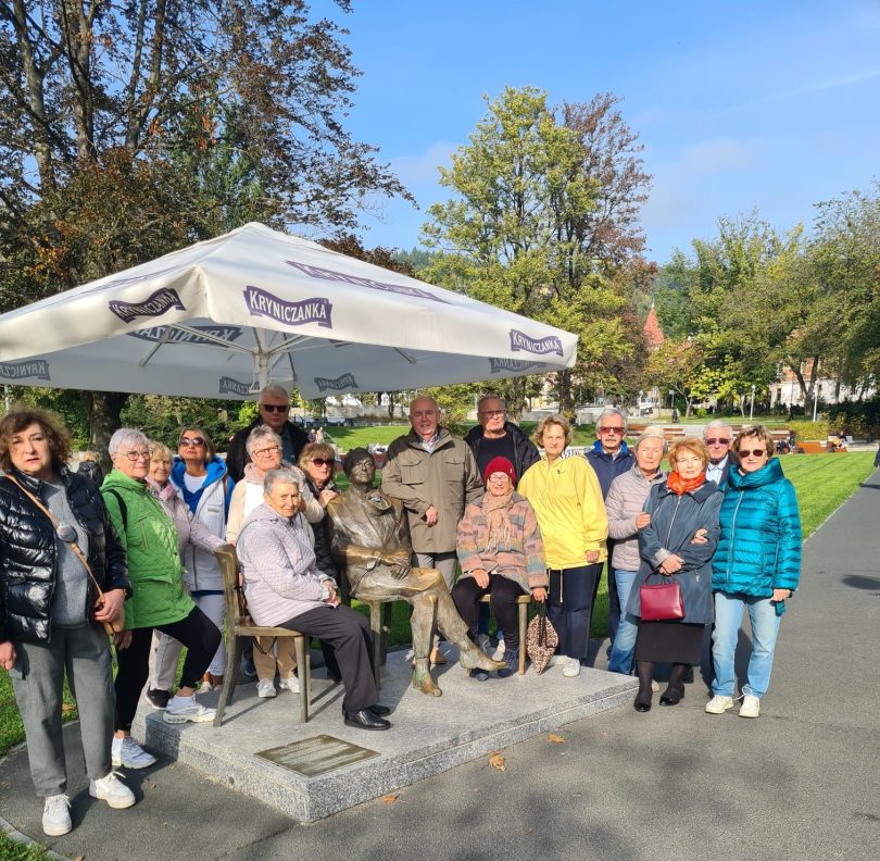 Prawie wszyscy znamy się już od wielu, wielu lat i nie wyobrażamy sobie, aby kolejny raz nie przyjechać tam gdzie będą pozostali. Powitaniom nigdy nie ma końca a pożegnania są smutne lecz z nadzieją, że na następny rok znowu będziemy razem. Jak to w rodzinie bywa w naszej grupie też ciągle dochodzą nowe osoby (tym razem 12 osób) i już nas nie opuszczają. W Krynicy Zdroju codziennie po zabiegach i w soboty – niedziele wyjeżdżaliśmy na wycieczki zwiedzając okoliczne tereny, a niektórzy nawet wyruszyli na Słowację i Węgry, spacerowaliśmy, rozmawialiśmy. Chodziliśmy też na słynne koncerty krynickie. Był wieczorek taneczny w restauracji, ognisko góralskie, wspólna kawa w kawiarni, a na zakończenie, jak zawsze, wieczór w karczmie łemkowskiej. Przepiękne widoki z Góry Parkowej, Jaworzyny Krynickiej czy z Wieży Widokowej pozostaną na długo w pamięci. Cały czas korzystaliśmy też z ciepłej pogody jesiennej, słońce świeciło, a różne kolory liści na drzewach wyglądały bajecznie. Oj, żal było wyjeżdżać…. Jednak wiosną znowu gdzieś wyjedziemy, a już na pewno spotkamy się w czerwcu w Krynicy Morskiej i jesienią w Krynicy Zdroju.