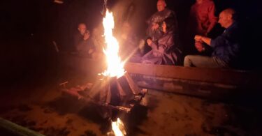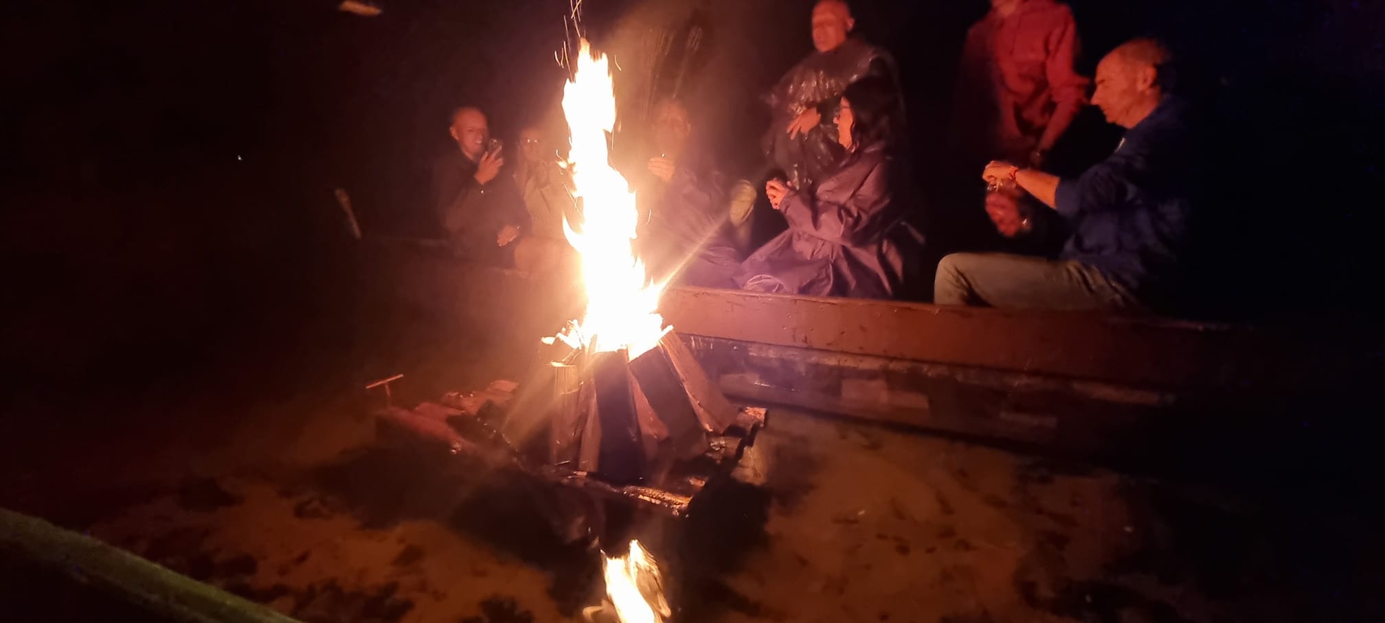 W czasie kolacji grillowej w Stanicy Krutynianka, w przerwie pomiędzy burzami, udaliśmy się na wieczorny spływ łodziami „pychówkami”, podczas którego mieliśmy okazję smażyć kiełbaski na ognisku umiejscowionym na rzece.