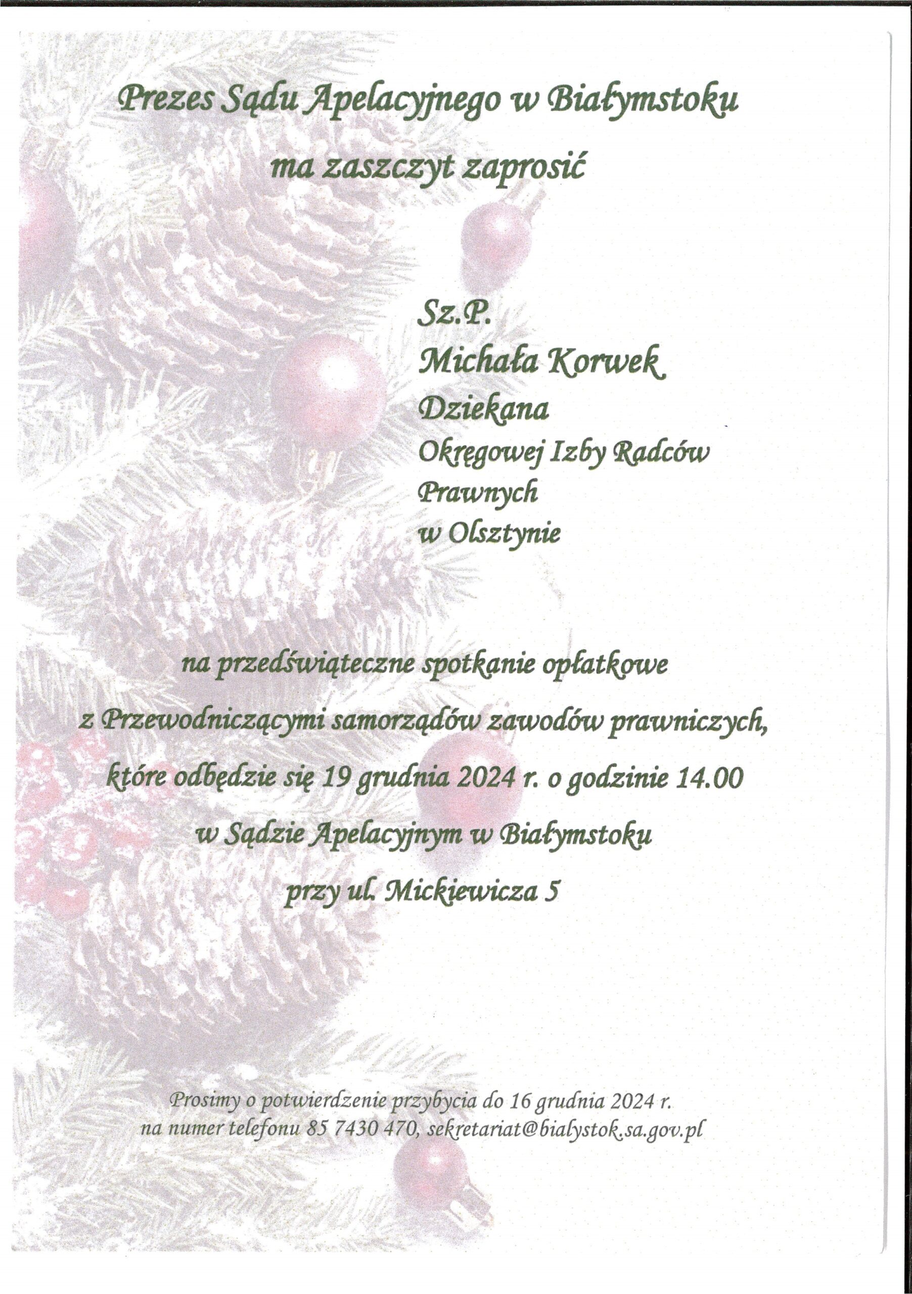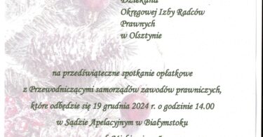 W dniu 19.12.2024 r. na zaproszenie Prezesa Sądu Apelacyjnego w Białymstoku odbyło się przedświąteczne spotkanie opłatkowe samorządów zawodów prawniczych. Oprócz prezesa Sądu Apelacyjnego SSA Krzysztofa Adamiaka obecni byli adw. Jowita Grochowska Dziekan ORA Białystok, Przemysław Ślepowroński Dziekan OIRP Białystok, Prezes Wojewódzkiego Sądu Administracyjnego w Białystoku Andrzej Melezini, Przewodniczący Izby Komorniczej w Białymstoku Michał Maciejczyk, Wiceprezes Izby Notarialnej w Białymstoku Artur Krzysztof-Gryczko oraz Dziekan OIRP Olsztyn Michał Korwek. Oprócz tematów świątecznych spotkanie dot. sytuacji wymiaru sprawiedliwości oraz problemów sędziów i pełnomocników.