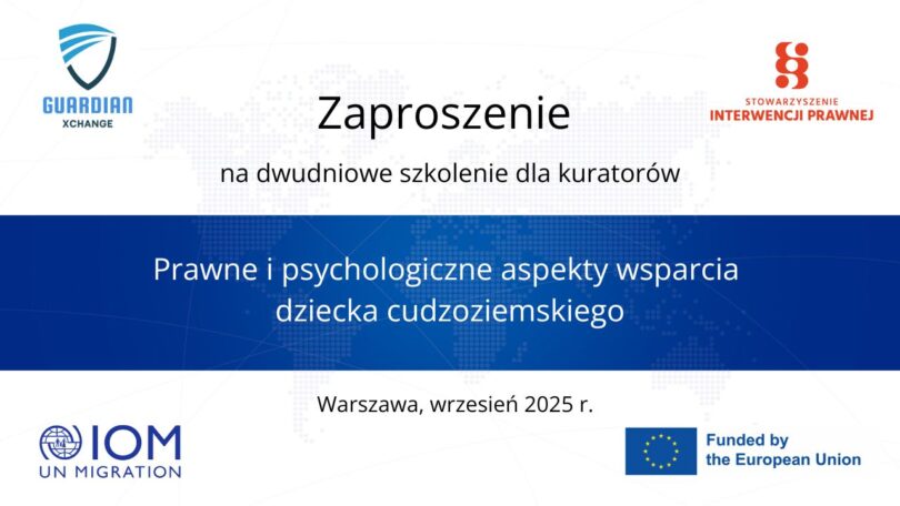 W imieniu Międzynarodowej Organizacji ds. Migracji (IOM Poland) i Stowarzyszenia Interwencji Prawnej zapraszamy kuratorów do udziału w dwudniowym szkoleniu organizowanym w ramach projektu GuardianXchange. Szkolenie ma na celu wzmocnienie kompetencji kuratorów w pracy z dziećmi cudzoziemskimi bez opieki, z uwzględnieniem zarówno aspektów prawnych, jak i psychologicznych.