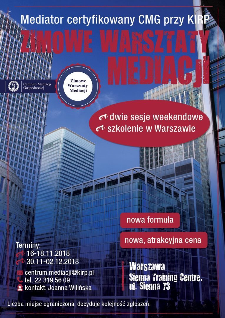 Centrum Mediacji Gospodarczej przy Krajowej Izbie Radców Prawnych zaprasza na Zimowe Warsztaty Mediacji wszystkich radców prawnych, którzy chcieliby uzyskać certyfikat i zostać wpisani na listę mediatorów certyfikowanych CMG przy KIRP oraz wykonywać zawód mediatora.