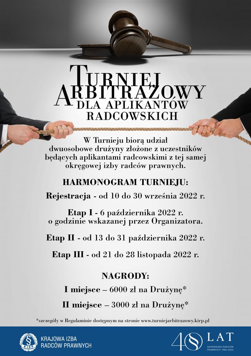 Krajowa Izba Radców Prawnych zaprasza aplikantów radcowskich do udziału w II edycji Turnieju Arbitrażowego. Rejestracja uczestników ruszyła 10 września i będzie trwała do 30 września br. Zgłoszenia dwuosobowych drużyn można dokonać poprzez formularz rejestracyjny na stronie www.turniejarbitrazowy.kirp.pl.
