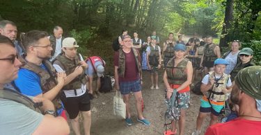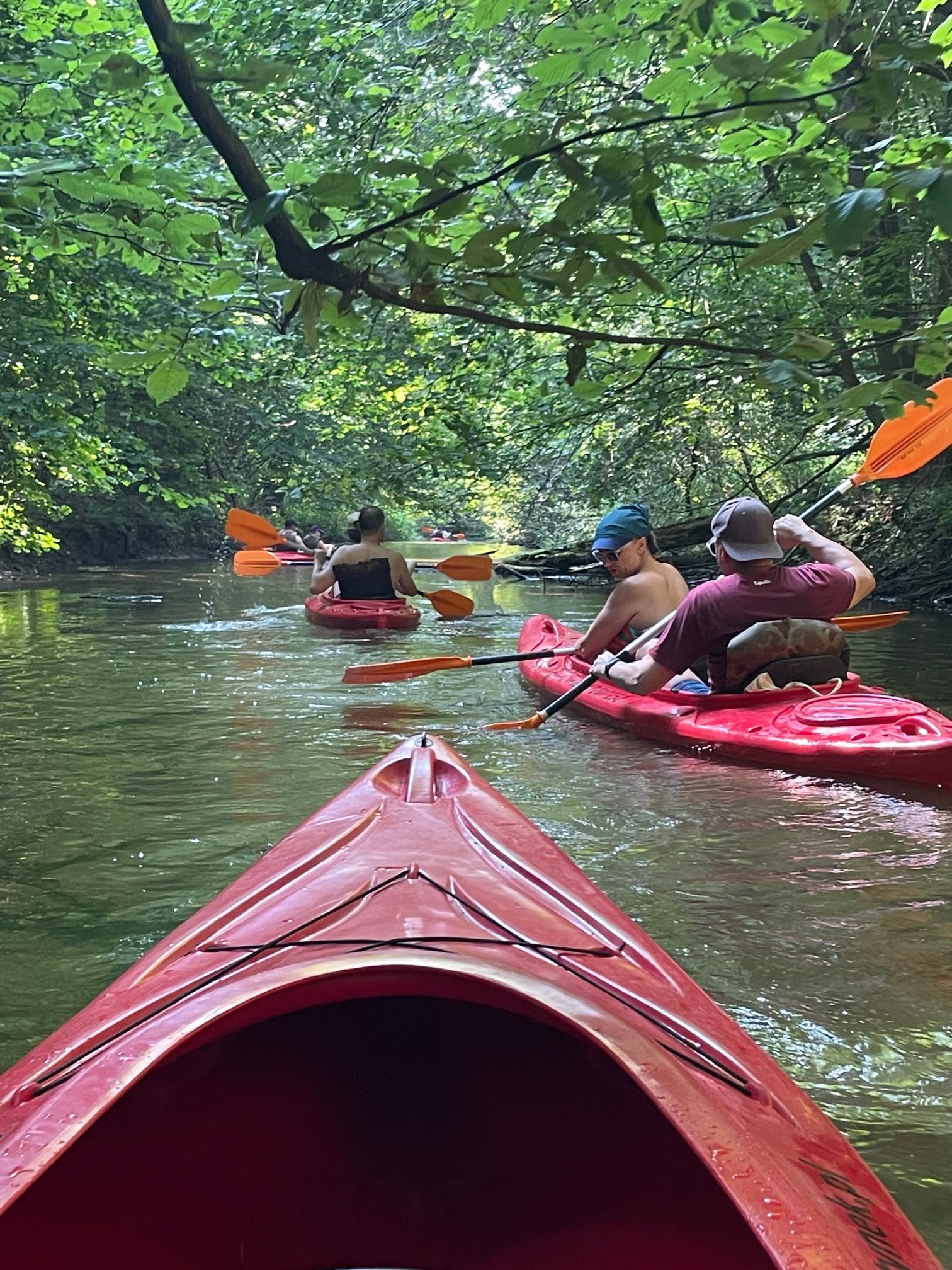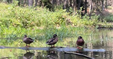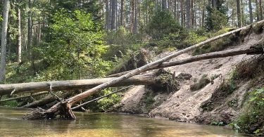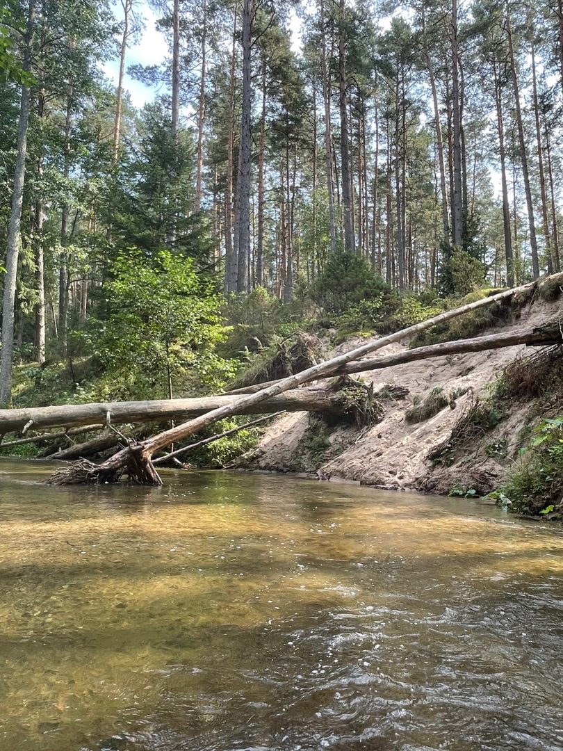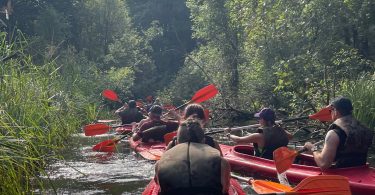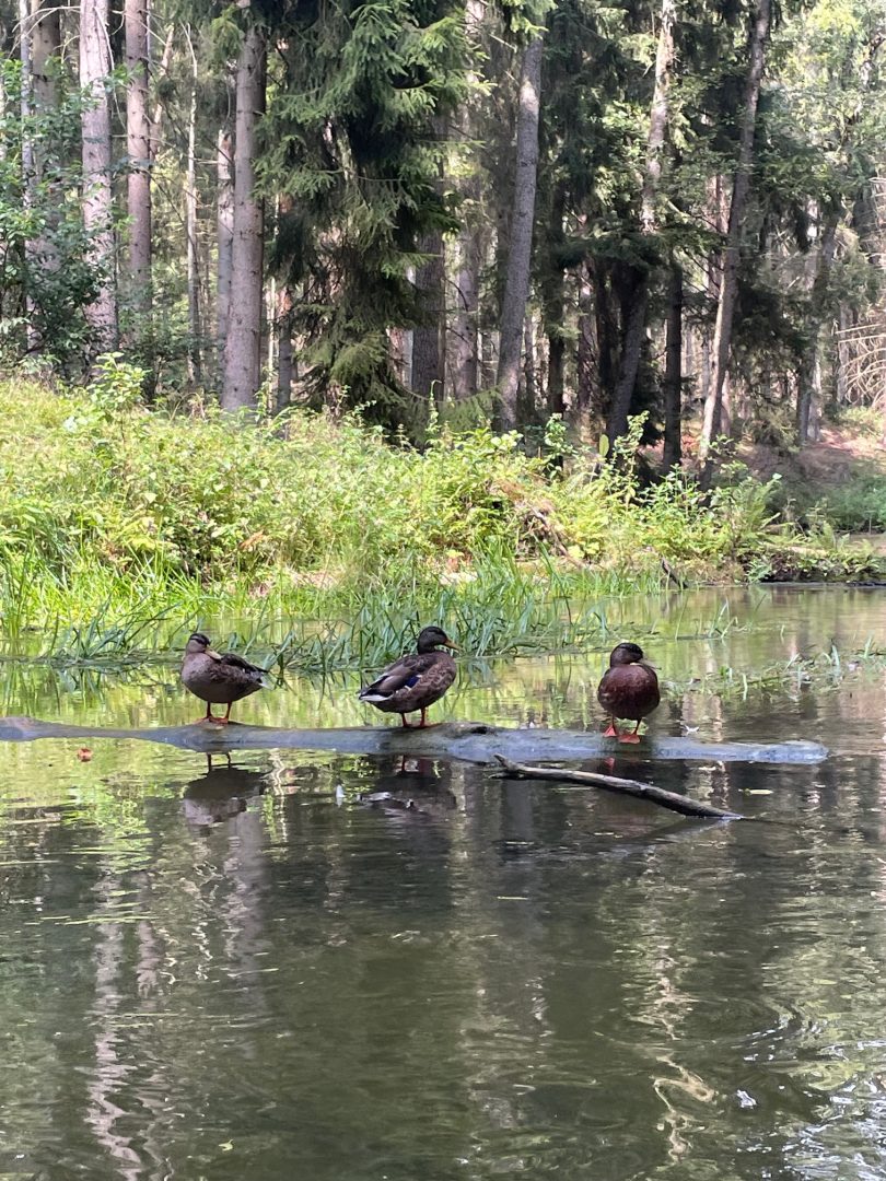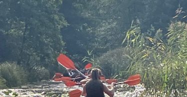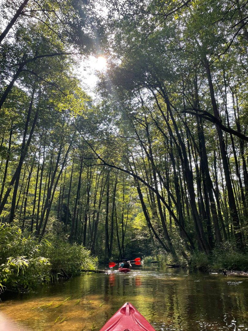 Trzeci odcinek jest najbardziej popularny i jak się okazało spotkaliśmy tam najwięcej kajakarzy. Niski poziom wody nie ułatwiał nam zadania, a szum wody zakłócał zgrzyt dna kajaka o piach lub kamienie. Ale mega widoki wynagradzały te niedogodności. Gdzieniegdzie w głębszych miejscach – lawirując między drzewami, można było zobaczyć pstrągi, a towarzyszące nam co chwila kaczki, sprawiały wrażenie oswojonych i rozbawionych przez walczących z prądem kajakarzy.
