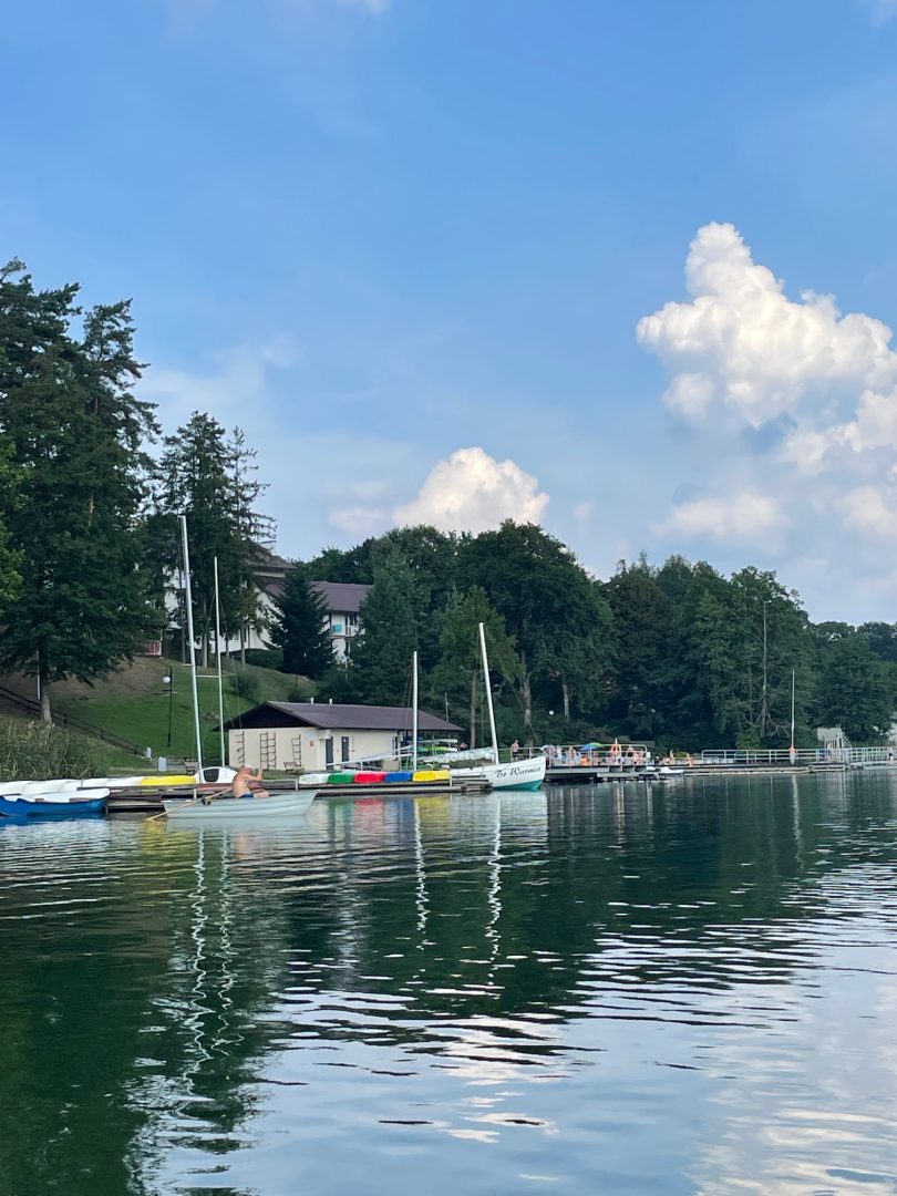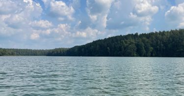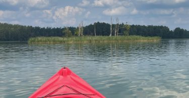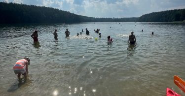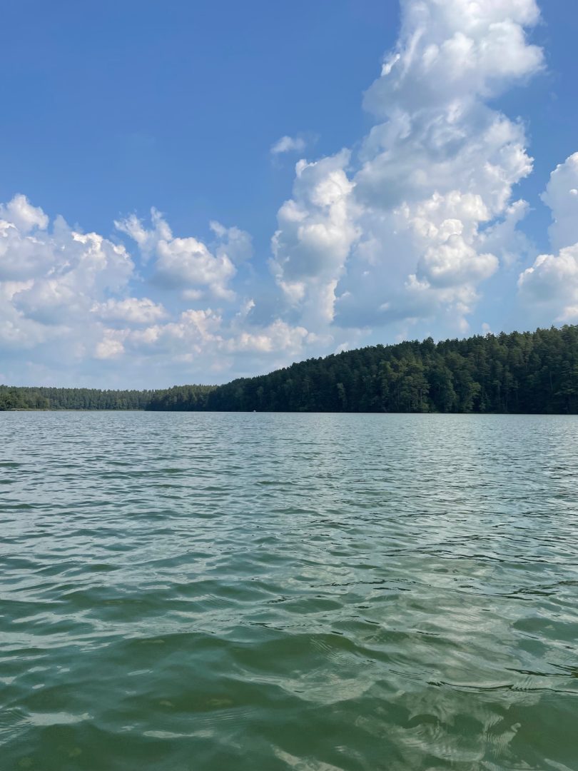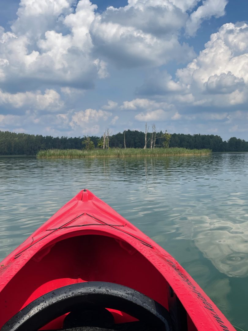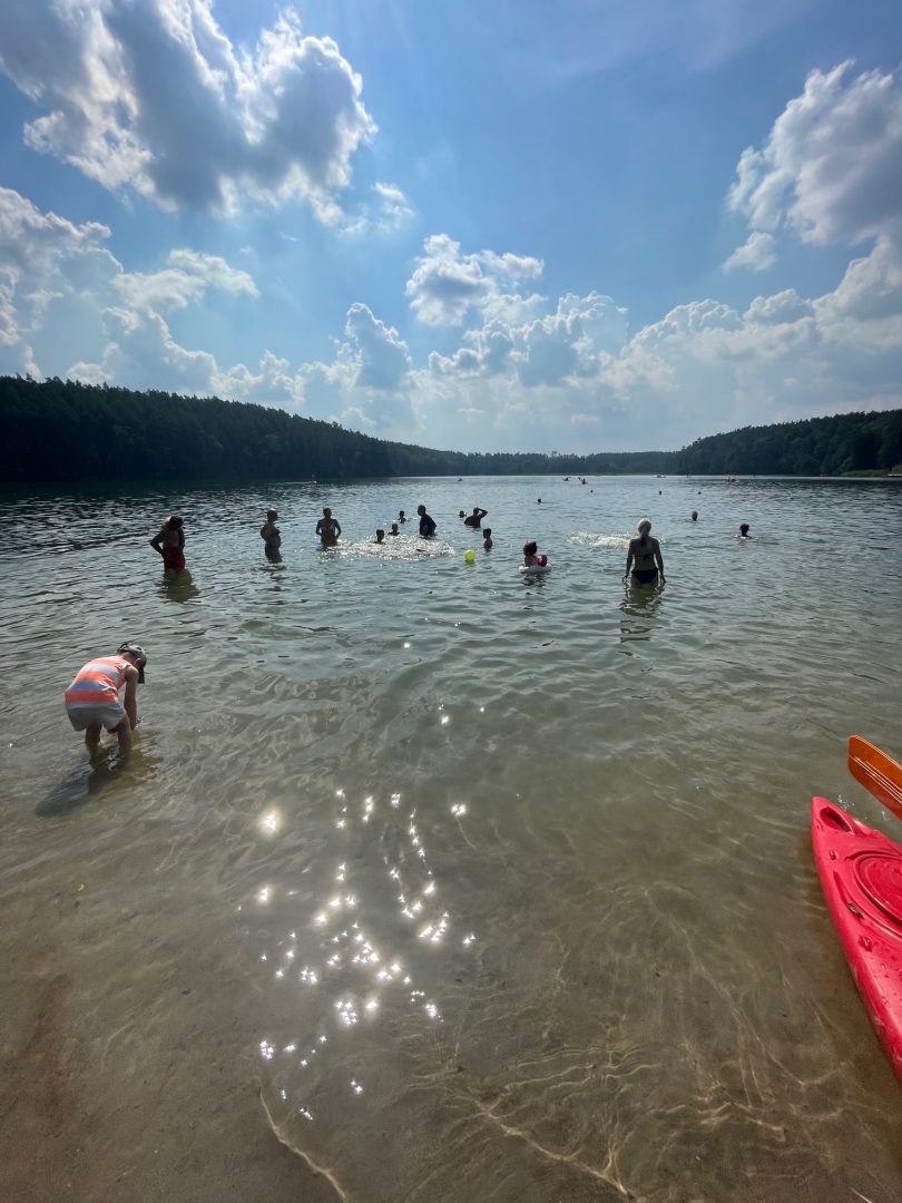 Drugi odcinek to jezioro Maróz – bez nas strefa ciszy – na początku kąpiel na plaży, rozprostowanie nóg i pozostałych części ciała, posiłek i dalej w wodę. Świecące słońce, lekki wiatr, szum fal, brak kormoranów, degustacje zawartości plecaków – to była chyba najfajniejsza część spływu. Następnie krótka przenioska i dalej w rzekę…