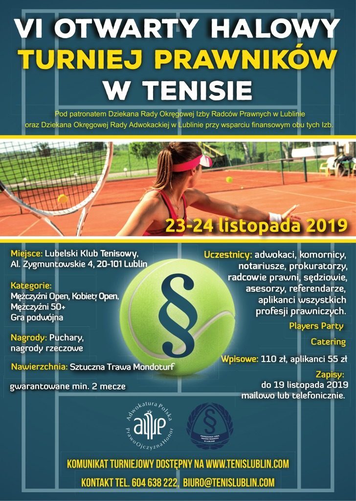 Sport i turystyka • Strona główna VI Otwarty Halowy Turniej Prawników w Tenisie 23-24 listopada 2019 r. 7 października 2019 Publikujemy zaproszenie do udziału VI Otwartym Halowym Turnieju Prawników w Tenisie 23-24 listopada 2019 r. Komunikat-turniejowy-2019 FacebookXLinkedIn