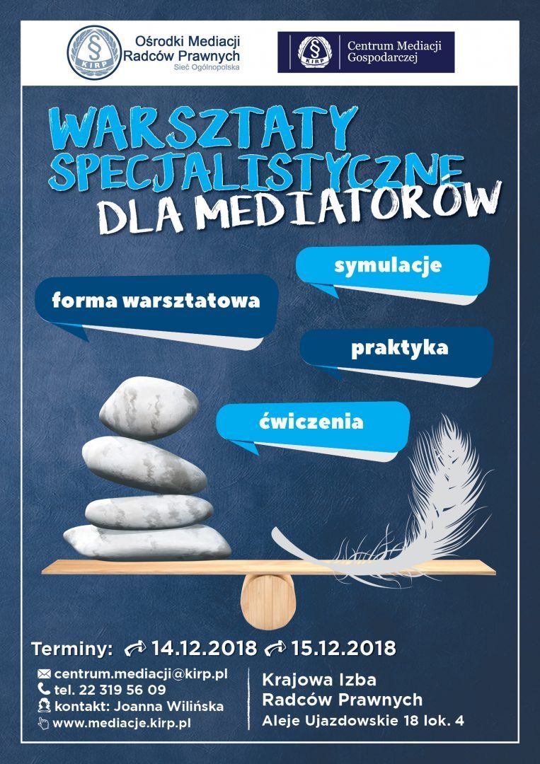 Centrum Mediacji Gospodarczej przy Krajowej Izbie Radców Prawnych zaprasza do udziału w Warsztatach Specjalistycznych dla Mediatorów, które odbędą się w Warszawie w siedzibie KIRP w dniach 14 oraz 15 grudnia br.