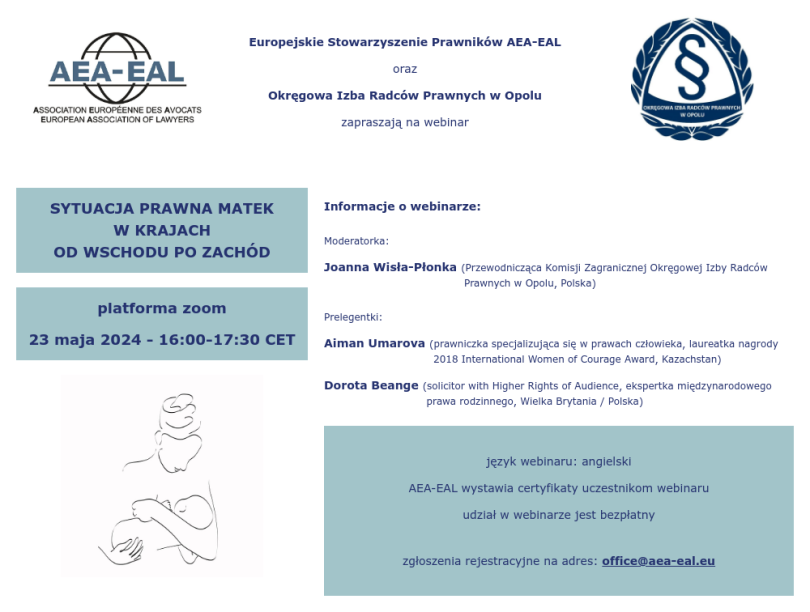 Webinar “Sytuacja prawna matek w krajach od wschodu po zachód” odbędzie się w środę 23 maja w godzinach 16:00-17:30. Wydarzenie organizowane jest wspólnie przez Europejskie Stowarzyszenie Prawników AEA-EAL oraz Okręgową Izbę Radców Prawnych w Opolu. Prelegentkami będą uznane na arenie międzynarodowej specjalistki zagadnienia. Webinar prowadzony będzie w języku angielskim na platformie ZOOM. Udział w wydarzeniu jest bezpłatny, Europejskie Stowarzyszenie Prawników AEA-EAL będzie wystawiać uczestnikom webinaru certyfikaty. Obowiązuje uprzednia rejestracja (zgłoszenia należy wysłać na adres: office@ara-eal.eu).