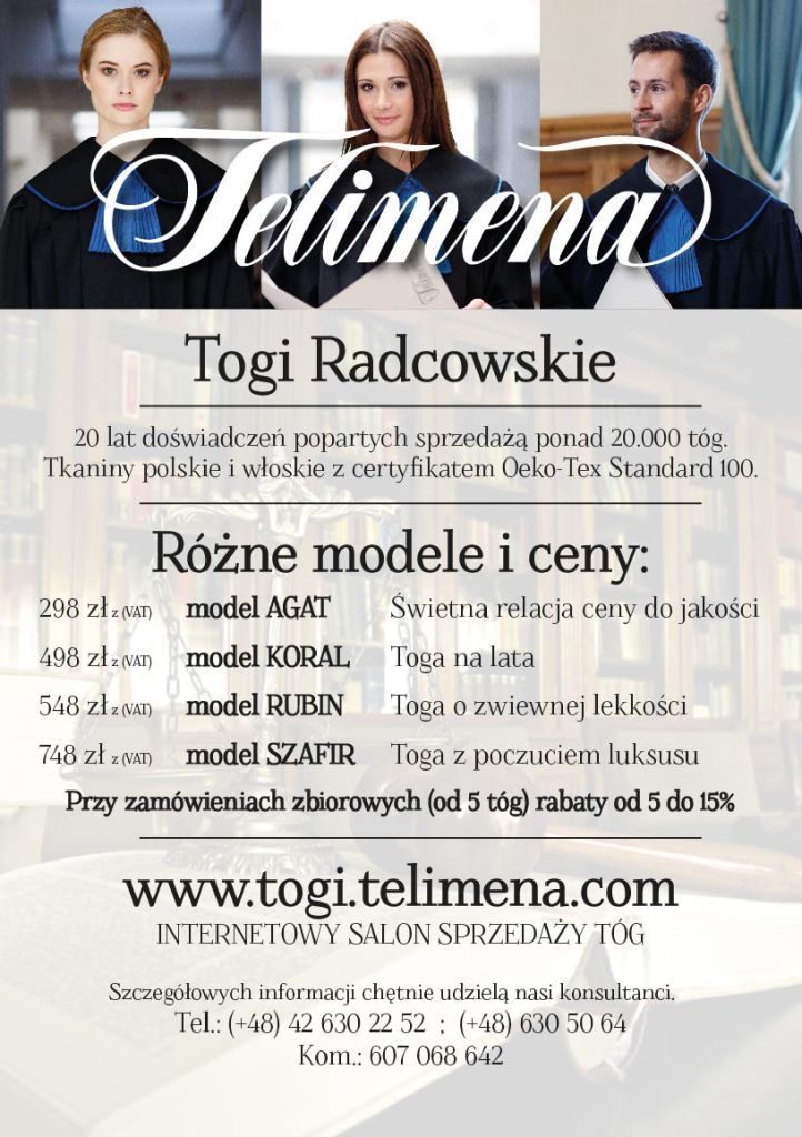 Uprzejmie informujemy, iż Okręgowa Izba Radców Prawnych w Olsztynie podpisała umowę o współpracy z Towarzystwem Akcyjnym Telimena SA, w wyniku czego Telimena ufunduje prestiżową nagrodę w postaci togi radcowskiej dla osoby, która uzyskała najwyższy wynik na egzaminie radcowskim w 2016 r..