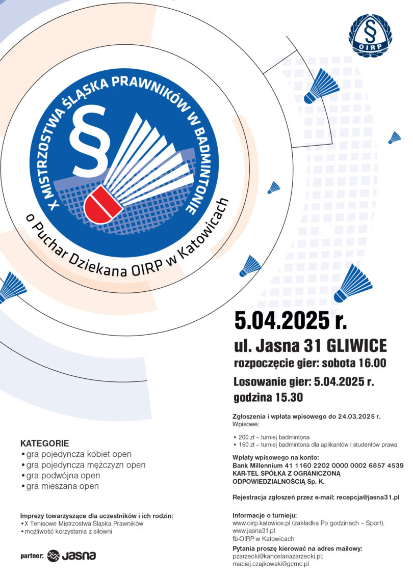 Turniej badmintona – X Badmintonowe Mistrzostwa Śląska Prawników – rozpocznie się w sobotę 05.04.2025 r. od godziny 16.00 na hali sportowej obiektu. Przewiduje się kat. open mężczyzn i kobiet, deble i miksty, w zależności od ilości zgłoszeń.