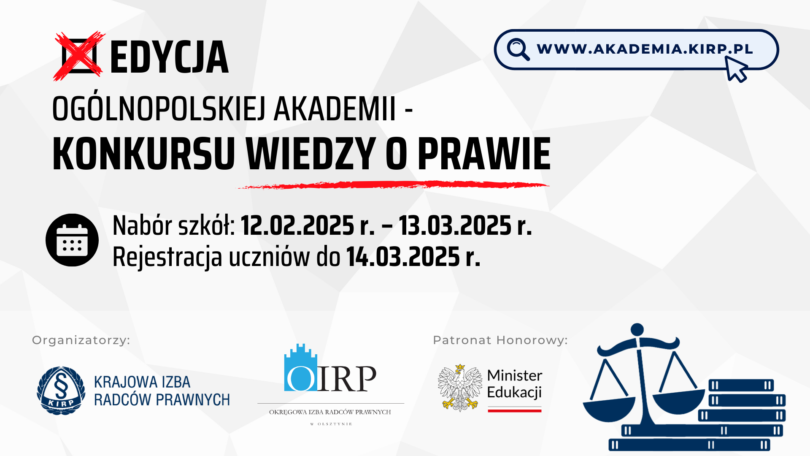 Jubileuszowa edycja prestiżowego konkursu dla uczniów klas V–VIII szkół podstawowych i szkół ponadpodstawowych wraca w zmienionej formule. Uczestnicy będą mogli sprawdzić swoją wiedzę prawniczą i zmierzyć się z rówieśnikami w Ogólnopolskiej Akademii – Konkursie Wiedzy o Prawie organizowanym przez Krajową Izbę Radców Prawnych. Rejestracja szkół potrwa do 13 marca, a uczestników – do 14 marca 2025 roku.