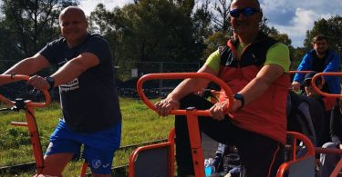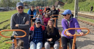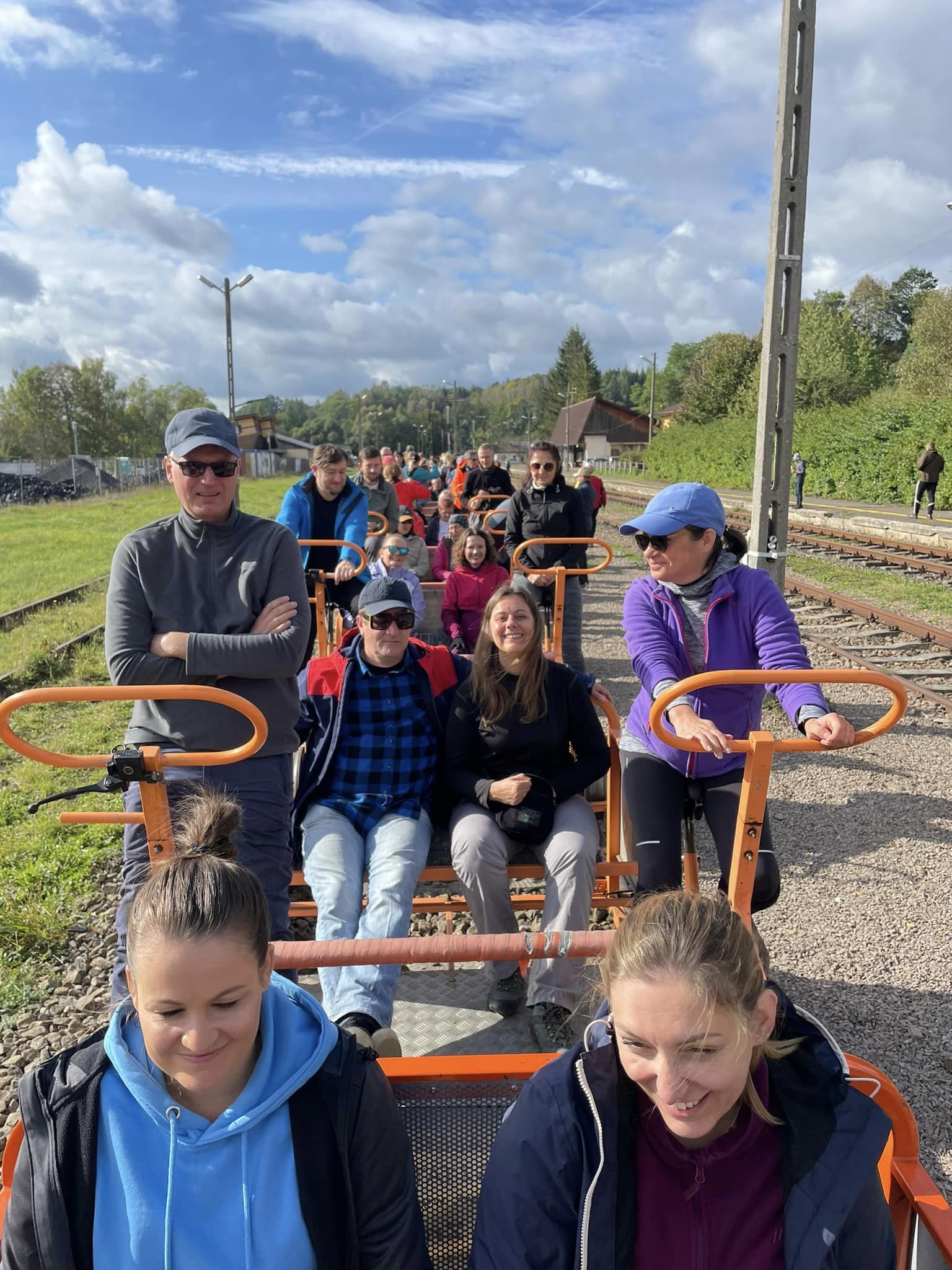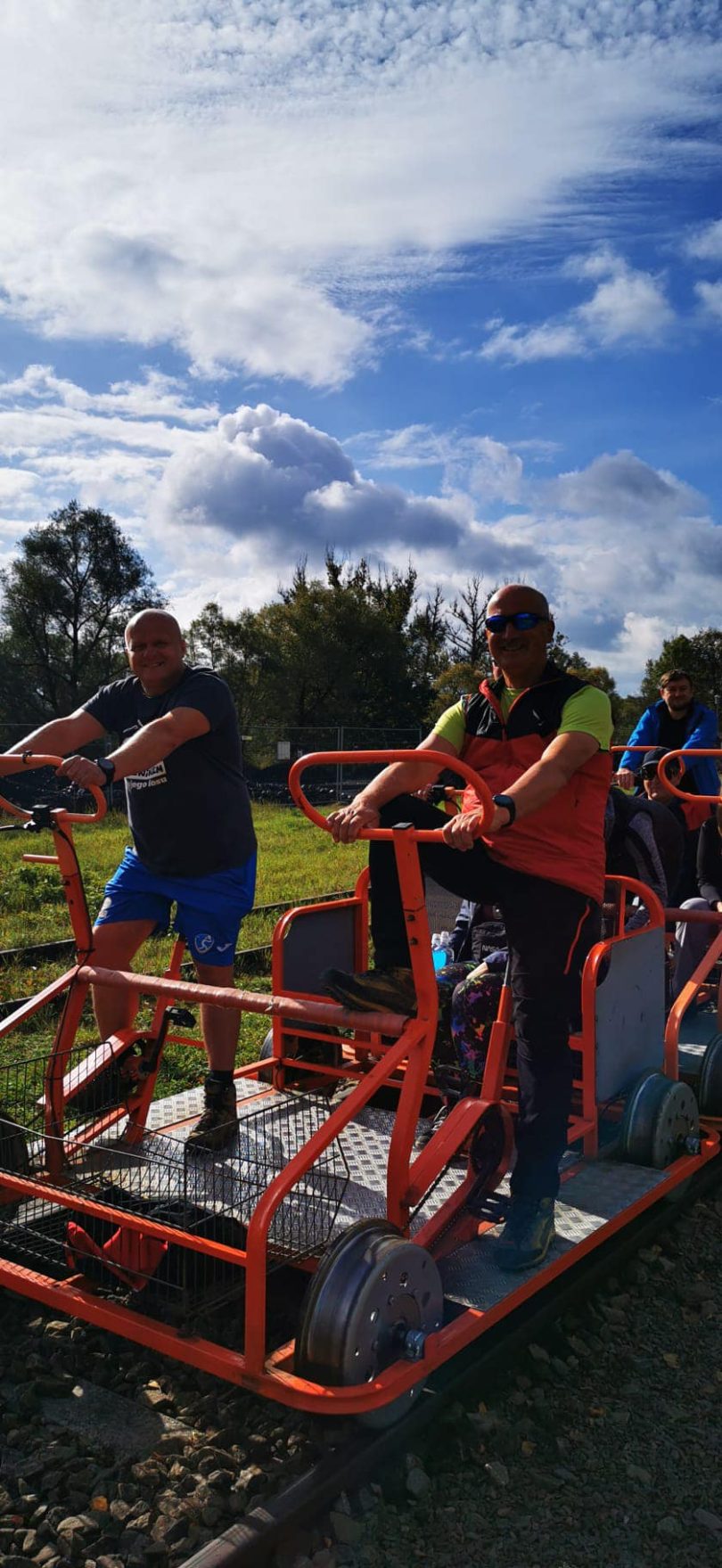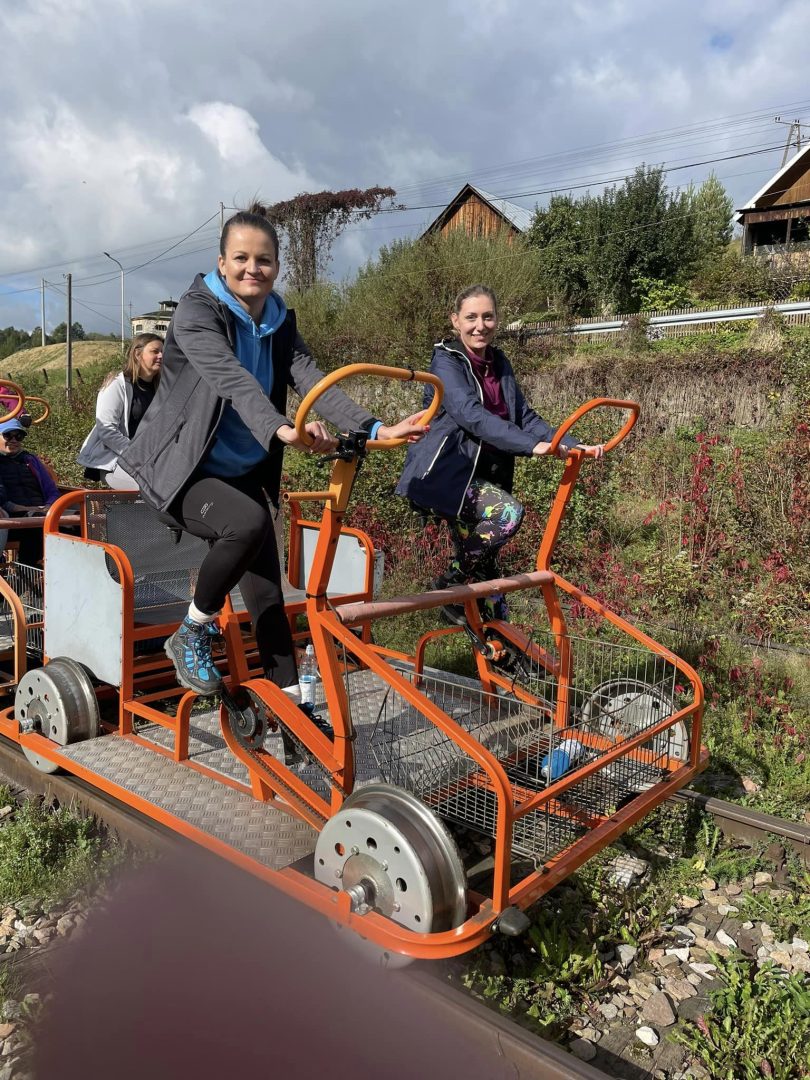 Drugi dzień był zdecydowanie mniej wymagający od pierwszego. Tego dnia ruszyliśmy w podróż rowerowymi drezynami z Uherzec Mineralnych do Olszanicy i z powrotem (trasa nieco ponad 8 km). W pierwszej chwili obawialiśmy się czy damy radę przejechać całą trasę na takich „cudacznych” pojazdach. Jednakże, jak ruszyliśmy okazało się, że każdy z nas ma duży zapas sił w nogach i jazda sprawiała nam tylko przyjemność. Choć moja załoga trafiła na drezynę z zablokowanym hamulcem i w stronę Olszanicy było nam naprawdę ciężko. Następnie, po krótkim pobycie w Bieszczadzkiej Wytwórni Piwa Ursa Maior, ruszyliśmy do Ustianowej, skąd przeszliśmy na pasmo Żukowa (761 m n.p.m.) do wieży widokowej na Holicy (35 m wysokości). Wieża została oddana do użytku w bieżącym roku i jest niewątpliwie atrakcją godną polecenia, bowiem roztacza się z niej panoramiczny widok na Bieszczady. Wieczorem czekał na nas regionalny poczęstunek oraz zabawa z Dj-em.