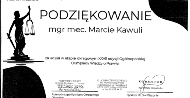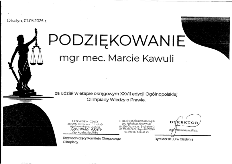 W dniu 1 marca 2025 roku w III Liceum Ogólnokształcącym im. Mikołaja Kopernika w Olsztynie odbył się etap okręgowy XXVII edycji Ogólnopolskiej Olimpiady Wiedzy o Prawie.