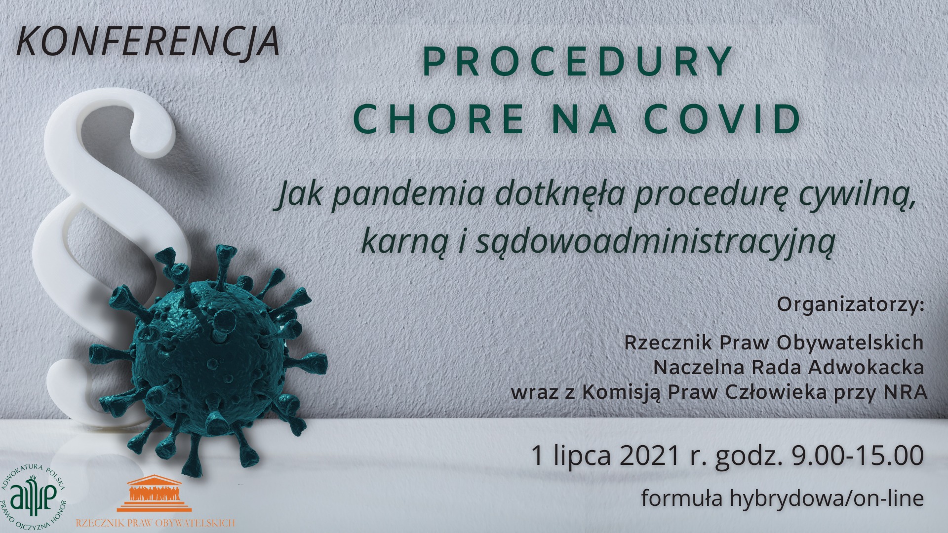 w imieniu Przewodniczącej Komisji Praw Człowieka przy Naczelnej Radzie Adwokackiej, adw. Natalii Klima-Piotrowskiej, serdecznie zapraszam na konferencję „Procedury chore na COVID? Jak pandemia dotknęła procedurę cywilną, karną i sądowoadministarcyjną” organizowaną wspólnie przez Rzecznika Praw Obywatelskich dr. hab. Adama Bodnara i Naczelną Radę Adwokacką wraz z Komisją Praw Człowieka przy Naczelnej Radzie Adwokackiej.
