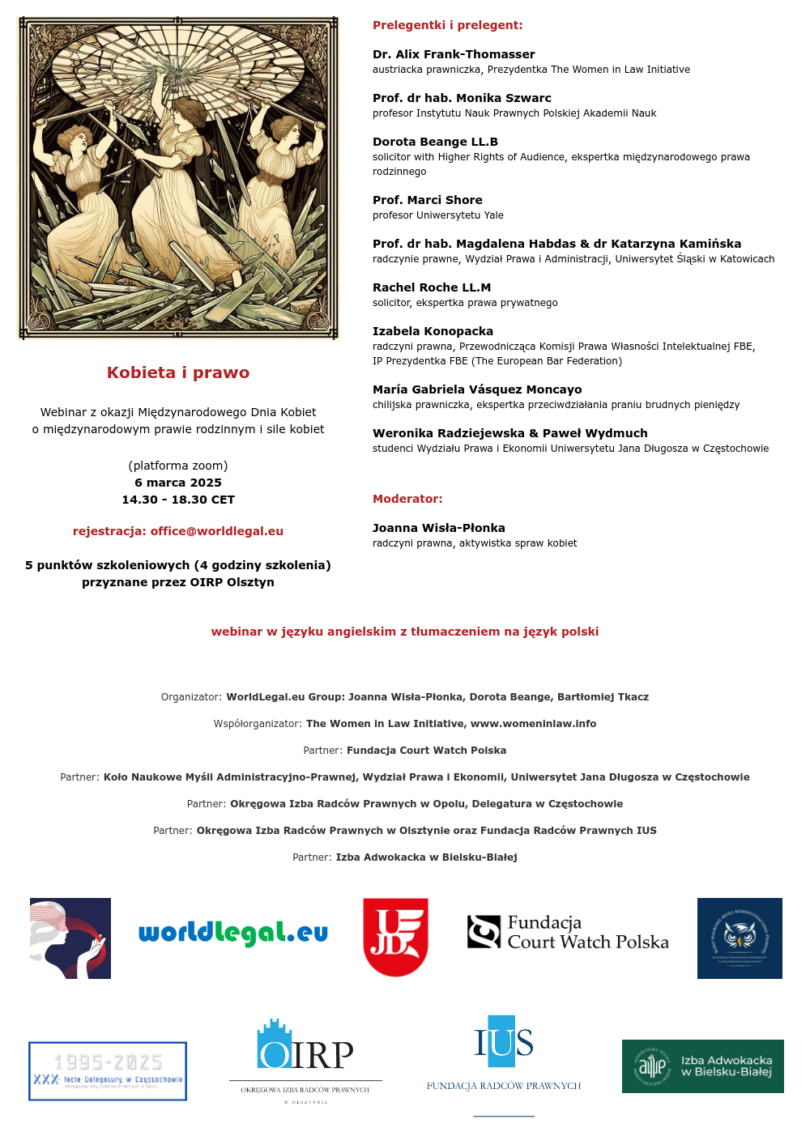 OIRP Olsztyn oraz Fundacja Radców Prawnych IUS jako partnerzy międzynarodowego webinaru, organizowanego z okazji Dnia Kobiet, mają przyjemność zaprosić Koleżanki i Kolegów na webinar pt. Kobieta i Prawo. Udział wezmą m.in. prof. Marci Shore (Uniwersytet Yale), prof. Monika Szwarc (Instytut Nauk Prawnych PAN), dr Alix Frank Thomasser (WomenInLawInitiative), prof. Magdalena Habdas & dr Katarzyna Kamińska (UŚ), Maria Garbiela Vasquez (Chile), Dorota Beange (solicitor England & Wales), Izabela Konopacka IP President FBE, Mayte Garcia (Hiszpania), Rachel Roche.