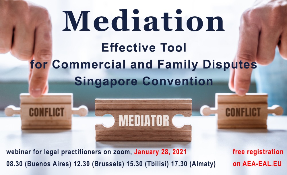 Mamy przyjemność zaprosić wszystkich radców prawnych do udziału w webinarium Europejskiego Stowarzyszenia Prawników (AEA-EAL) poświęconemu „Mediacji – Efektywnemu Narzędziu Rozwiązywania Sporów w sprawach Gospodarczych i Rodzinnych oraz Konwencji Singapurskiej”. Seminarium odbędzie się w czwartek, 28 stycznia o g. 12.30 i jest zaplanowane na 90 minut. Prelegentami są doświadczeni praktycy – prawnicy i mediatorzy z Argentyny, Belgii, Gruzji, Hiszpanii, Hong Kongu, Kazachstanu i Uzbekistanu, którzy reprezentują różne spojrzenia i rozwiązania prawne z trzech kontynentów. Językiem wykładowym będzie angielski. Dalsze informacje i bezpłatna rejestracja są dostępne na stronie aea-eal.eu.