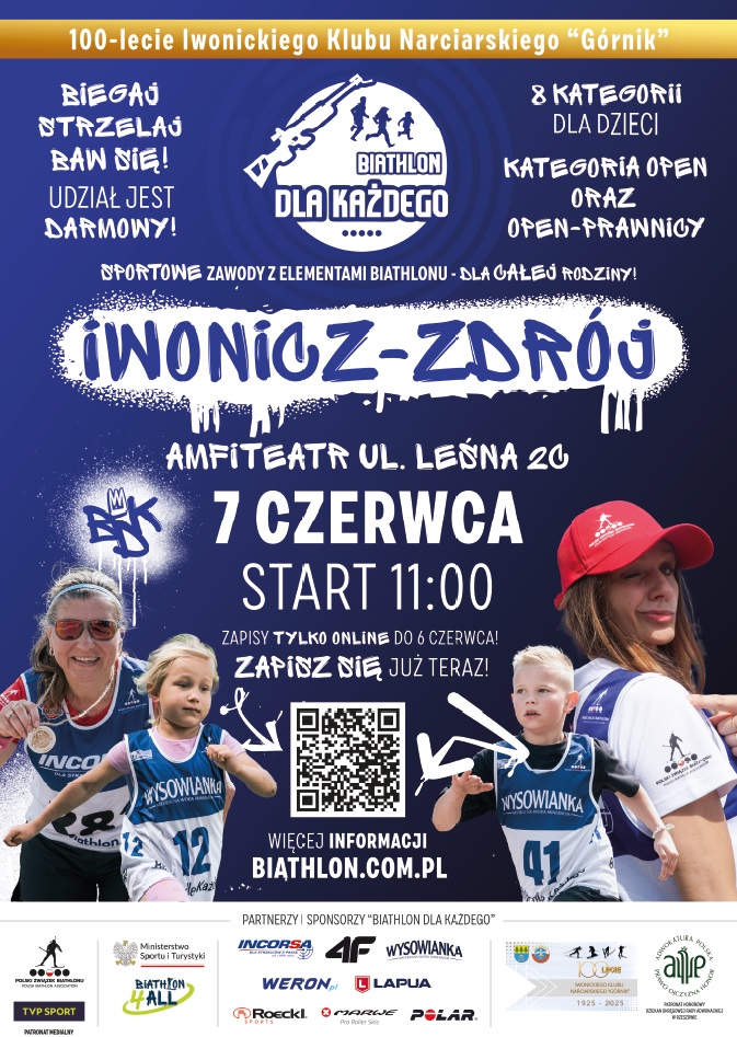 Zawody „Biathlon dla każdego” odbędą się w dniu 7 czerwca 2025 r., w Iwoniczu Zdroju. Organizatorzy przewidzieli kategorie wiekowe dla dzieci, młodzieży i dorosłych.